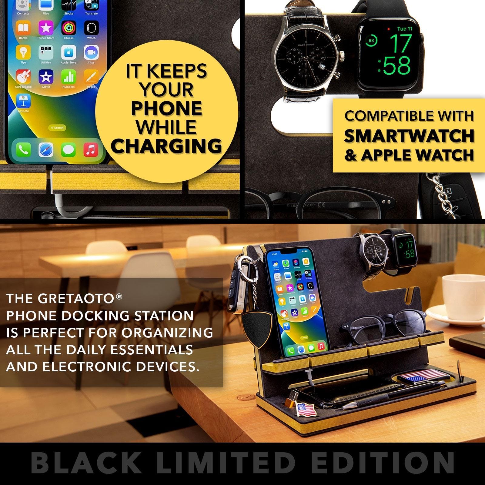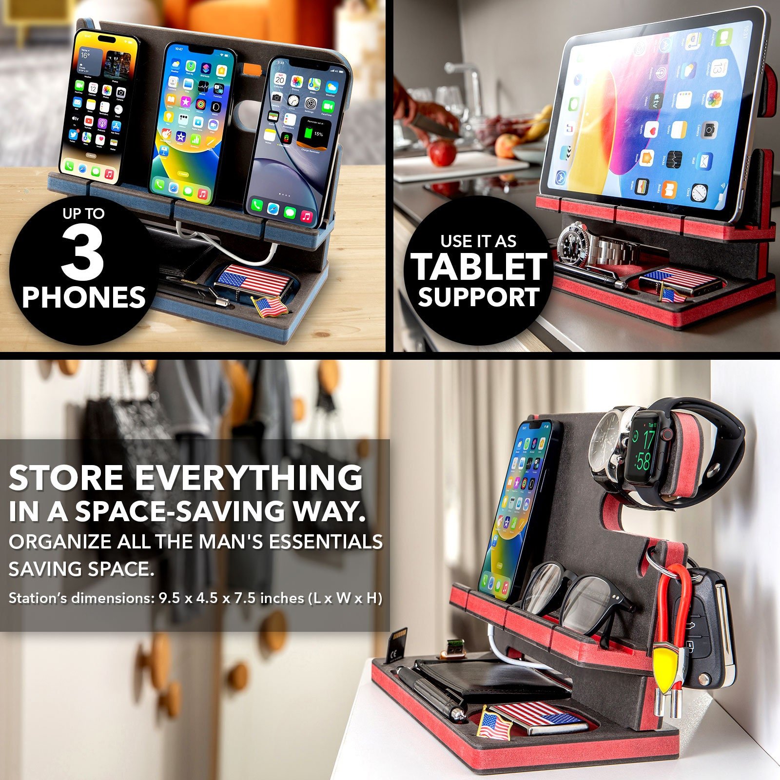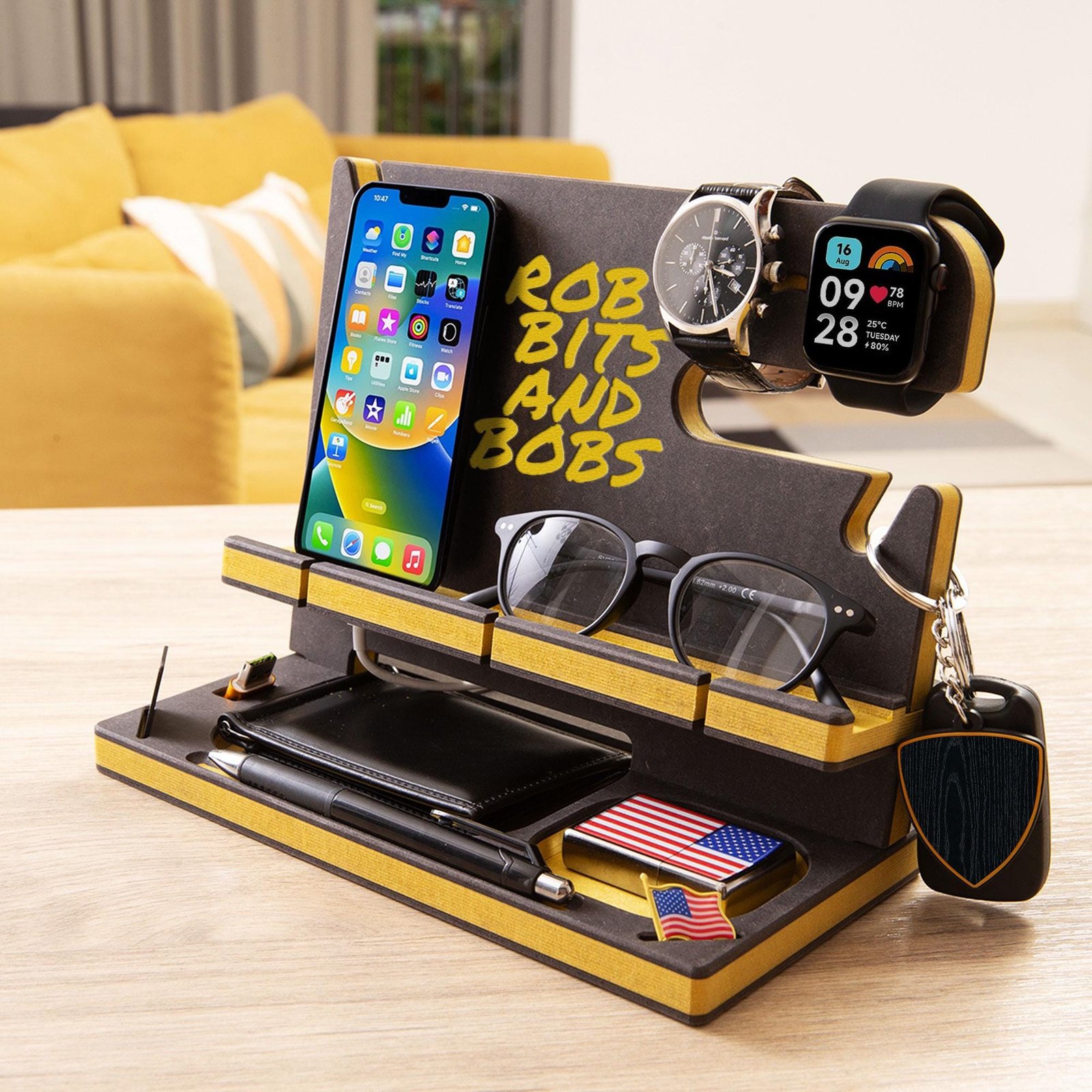 Desk Organizer, Wood Personalized Docking Station for Cell Phone, Tablet,Wallet, Essentials,Storage Stand Work Desk,Nightstand,Gifts for Men