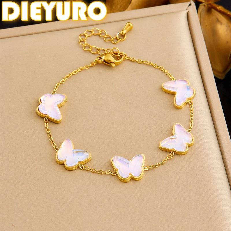 DIEYURO 316L Stainless Steel Pink Purple Colorful Crystal Butterfly Classic Bracelet Lady Trend Waterproof Wrist Chain Jewelry