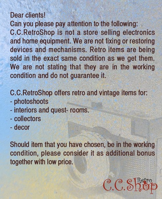 C.C.RetroShop is not a store selling electronics and home equipment. We are not fixing or restoring devices and mechanisms. Retro items are being sold in the exact same condition as we get them. We are not stating that they are in the working condition and do not guarantee it.
