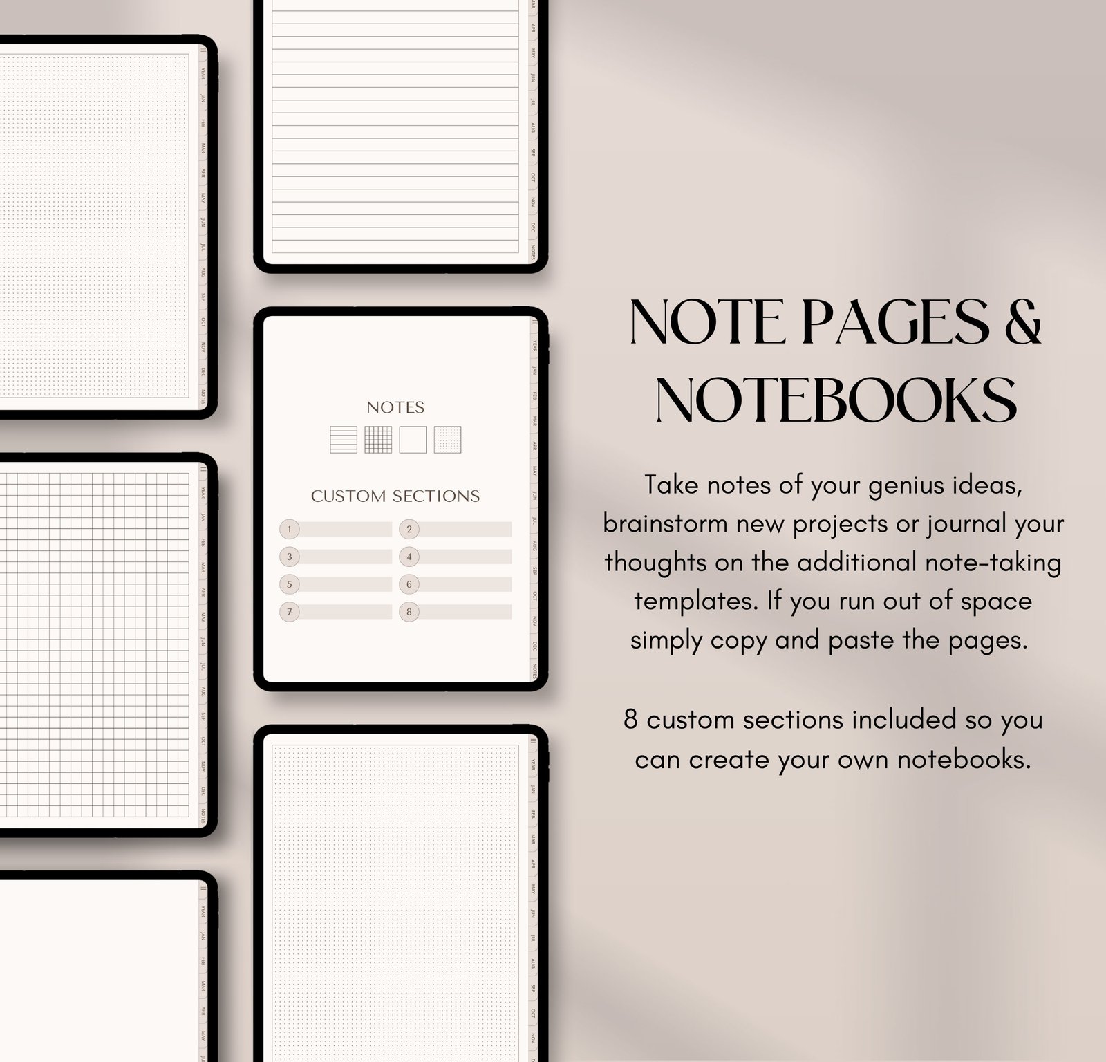 40 note-taking pages – lined, grid, dotted and blank – and 8 custom sections so you can create your own custom notebooks!