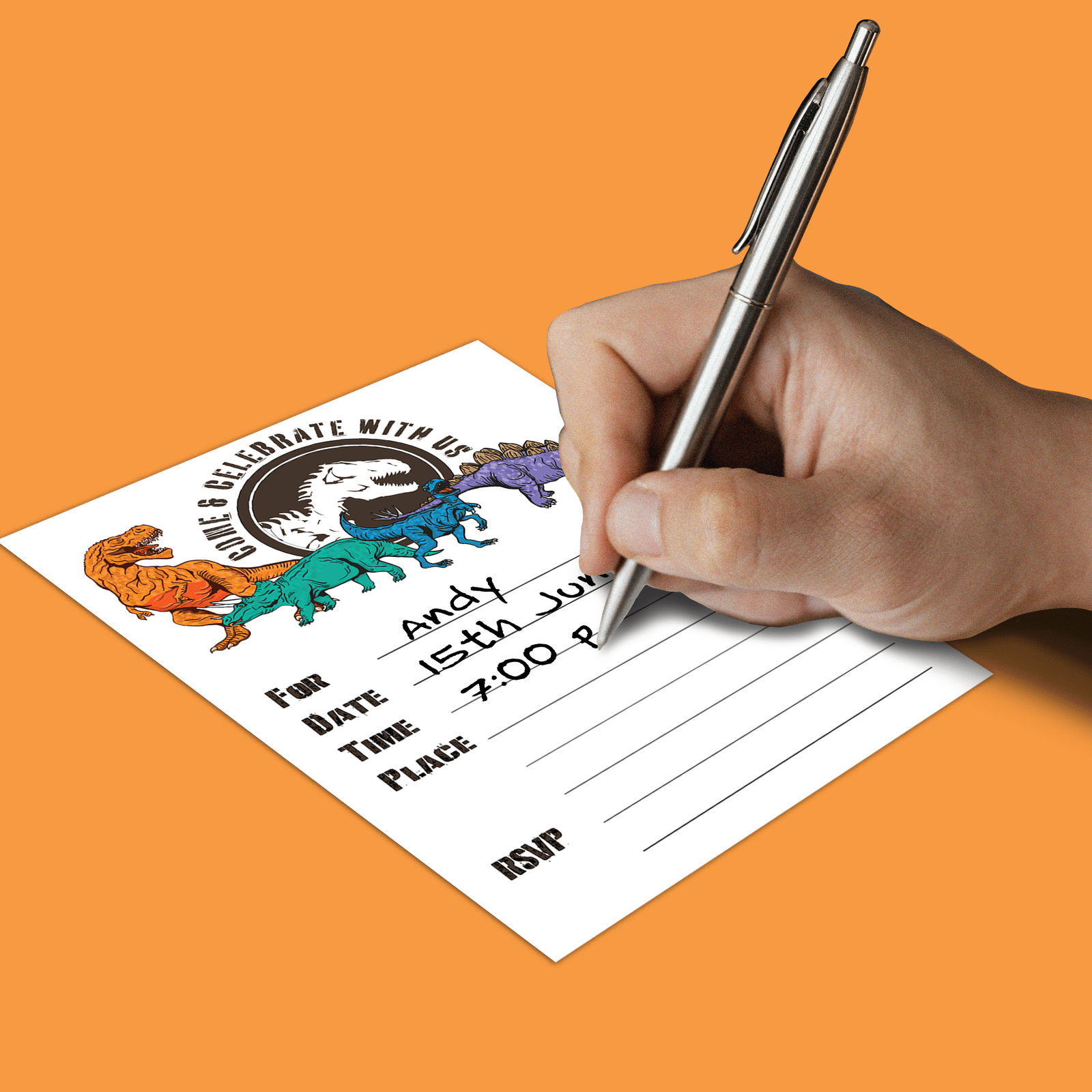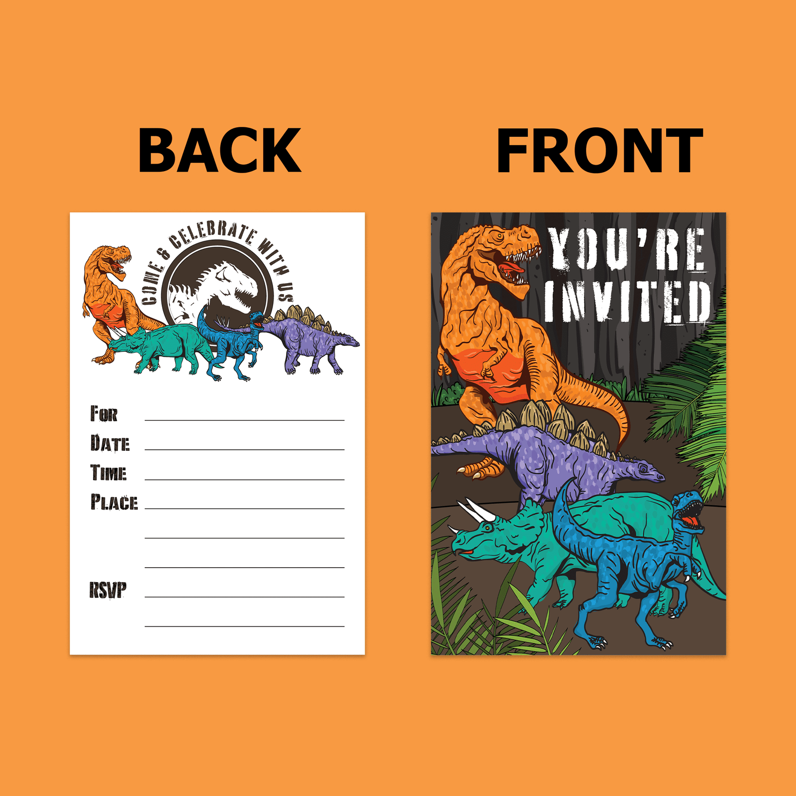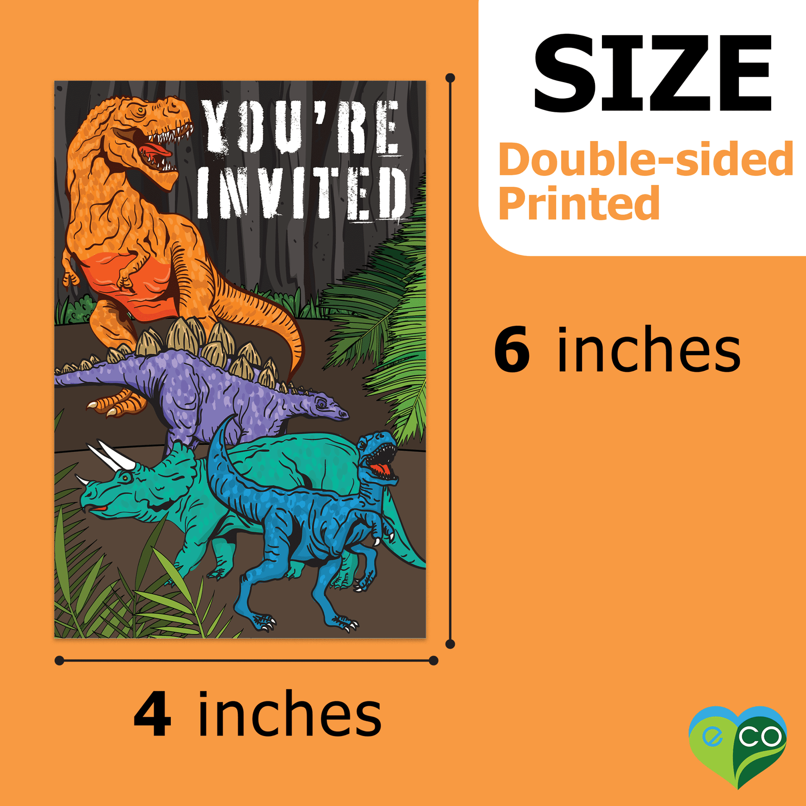 Dinosaur T-Rex Birthday Party Invites For Boys and Girls – 20 Count of 4 x 6 Inch Double Sided Fill-In Invitations With Wet To Seal Envelopes