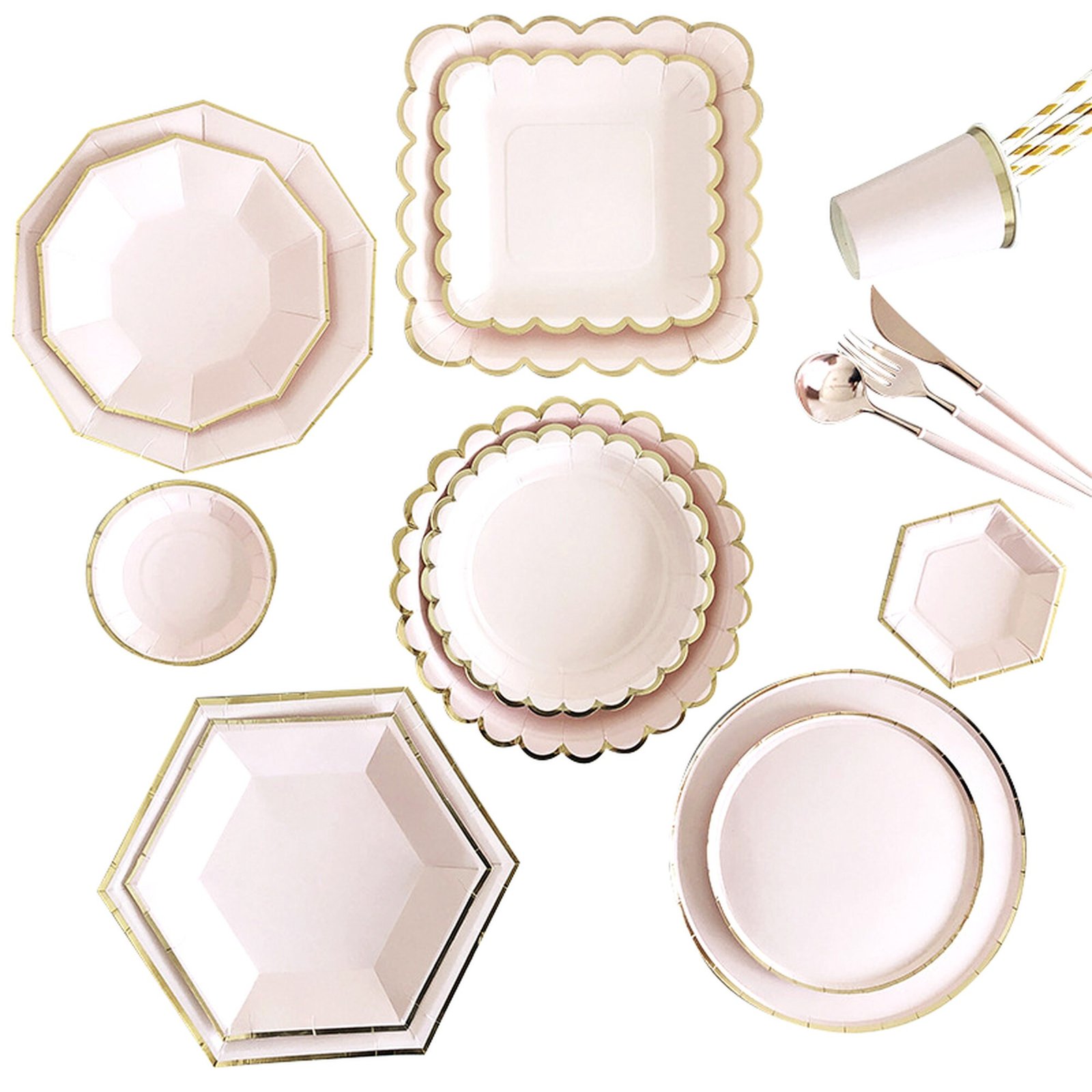 270ml Cups 8PCS ,33X33cm Napkins 16PC ,7in Round Plates 8PC ,9in Round Plates 8PC ,7in Square Plate 8PC ,9in Square Plate 8PC ,7in Wave Plates 8PCS ,9in Wave Plates 8PCS ,8in HexagonPlate 8PC ,10in HexagonPlate8PC ,7in DecagonPlate 8PC ,9in DecagonPlate 8PC ,10PCS Straws |