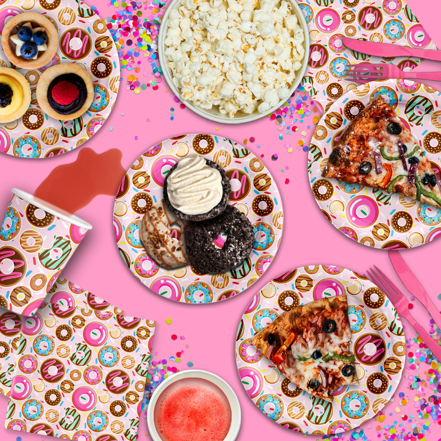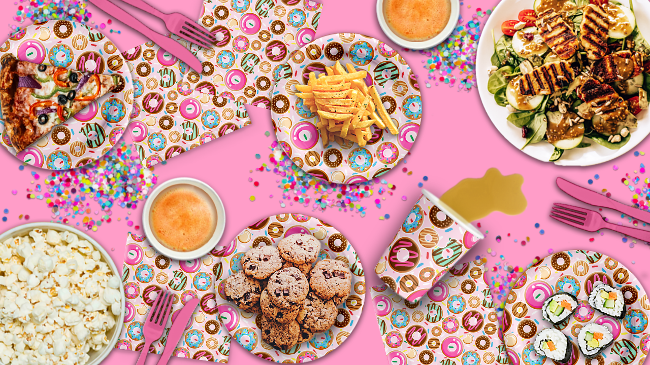 The Donut Shoppe Birthday Party Tableware Kit offers everything you need for a birthday gathering with sixteen friends or family. Each kit includes sixteen dessert plates, sixteen cups, and sixteen napkins, all designed with a cheerful, donut-themed pattern. Whether you’re planning an intimate afternoon tea party or a celebratory soiree, the kit has you covered. No need to shop around for different tableware pieces – everything you need is right here, in one box.