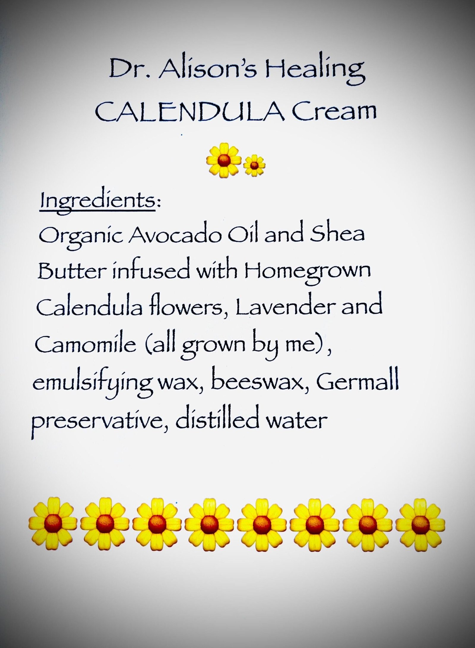 Dr. Alison’s Healing CALENDULA Cream was born when Dr. Alison developed an unexplainable excema chronic outbreak. After going to many doctors and not finding any answers she decided to experiment with the herbs in her garden. The cream has healed her eczema and others suffering with the same, as well as helping people with severe dry skin. The people with severe dry skin say they can finally recognize their hands again after wearing this cream :-