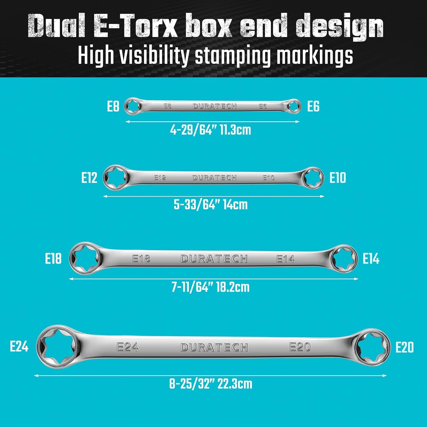 Dual E-Torx box end design with 4 wrenches to cover the 8 most common Torx, E6*E8, E10*E12, E14*E18 and E20*E24 to fit your different projects