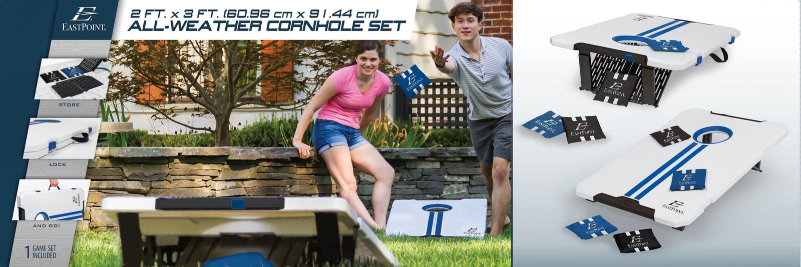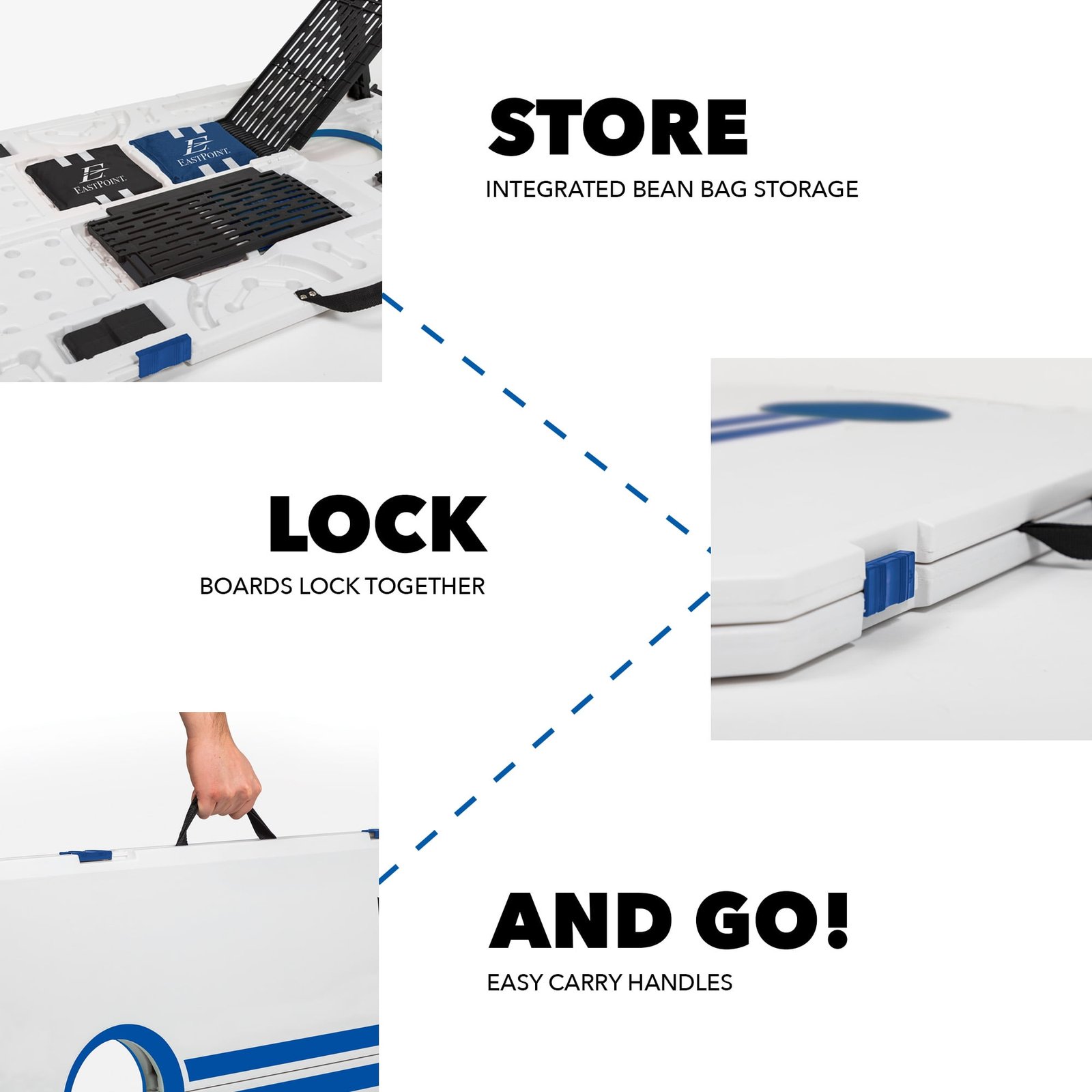 - Portable Gaming On-the-Go: Take your gaming adventures anywhere with the EastPoint 2 ft. x 3 ft. 91.44 cm x 60.96 cm All-Weather Cornhole Set – designed to store, lock, and go, making it the ultimate solution for outdoor entertainment that can accompany you to the beach or any backyard gathering.
