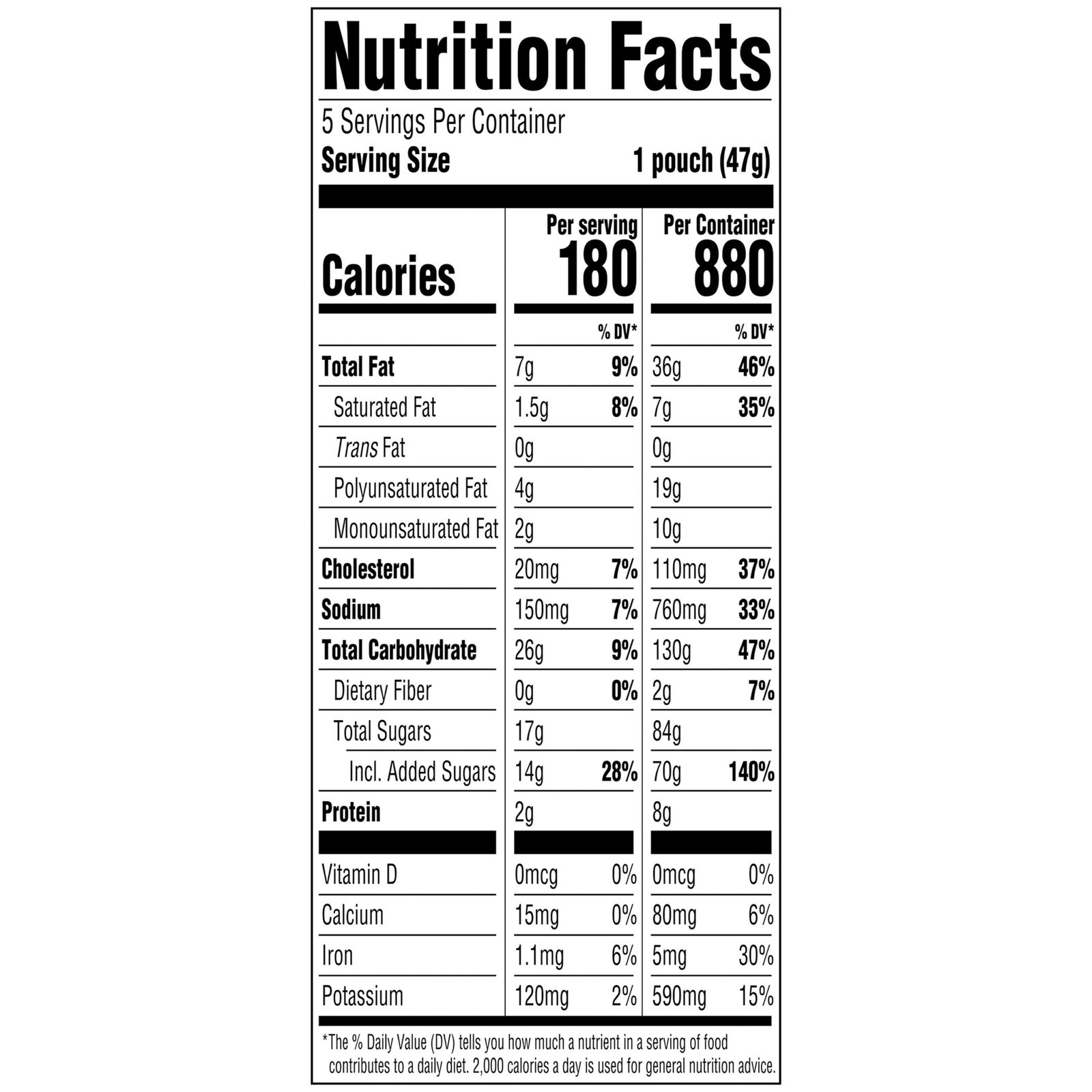- Nutrition FactsPer serving5 servings per containerServing Size1.00 pouchAmount Per ServingCalories180% Daily Value*Total Fat7g9%Saturated Fat1.5g8%Trans Fat0gPolyunsaturated Fat4gMonounsaturated Fat2gCholesterol20mg7%Sodium150mg7%Total Carbohydrate26g9%Dietary Fiber0g0%Total Sugars17gIncludes Added Sugars14g28%Protein2gVitamin D0mcg0%Calcium15mg0%Iron1.1mg6%Potassium120mg2%* The % Daily Value DV tells you how much a nutrient in a serving of food contributes to a daily diet. 2