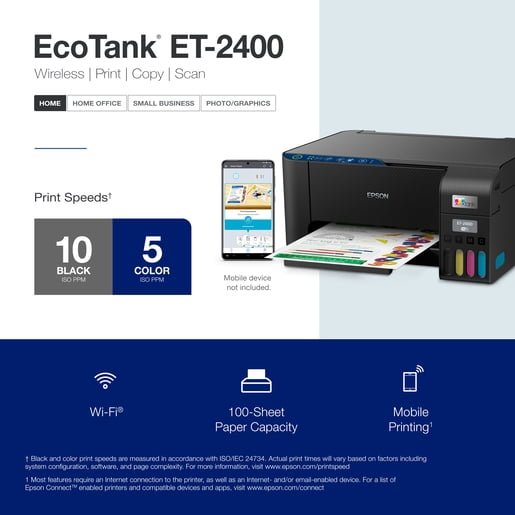 - High-Capacity Ink Tanks – Epson’s exclusive EcoFit ink bottles make filling easy and worry-free