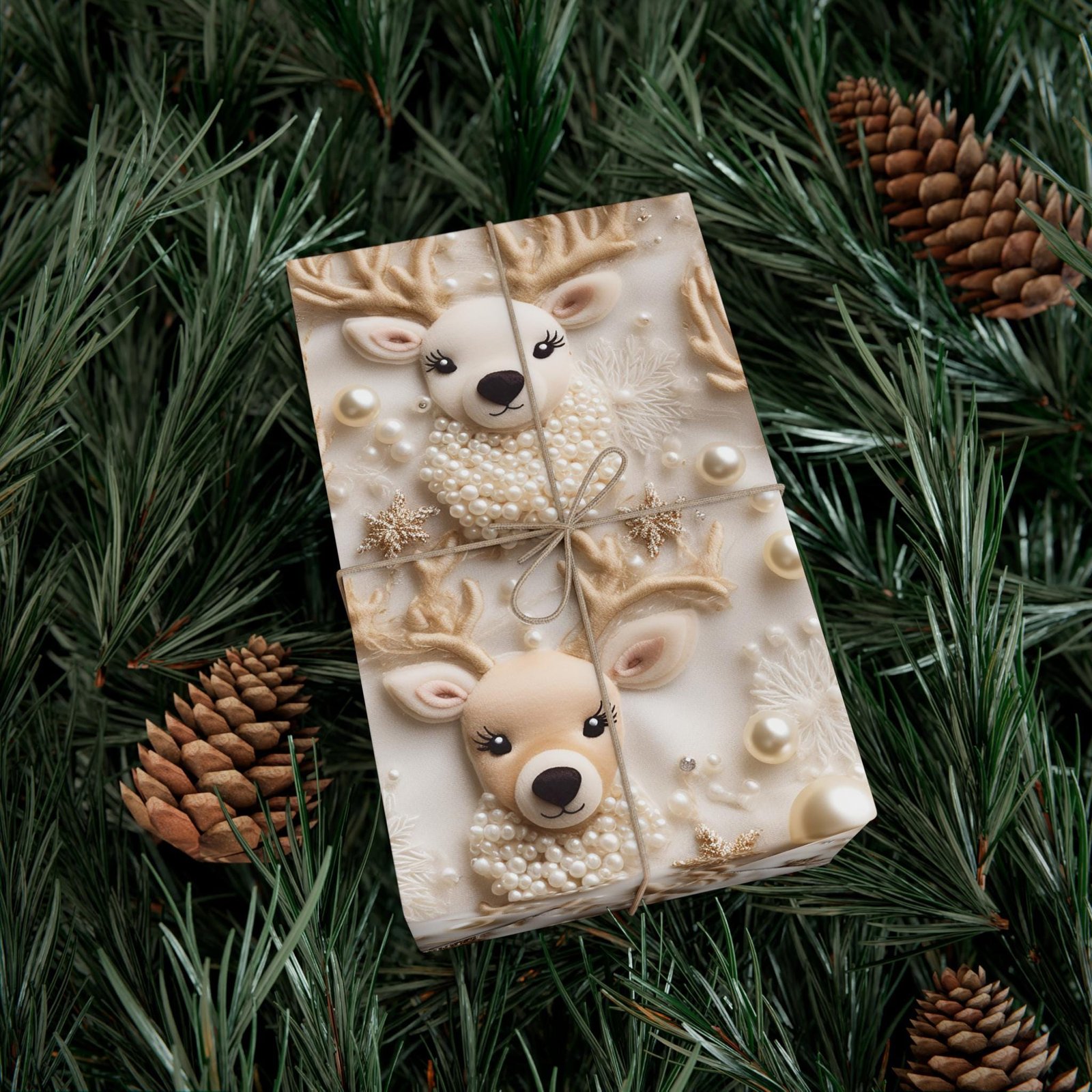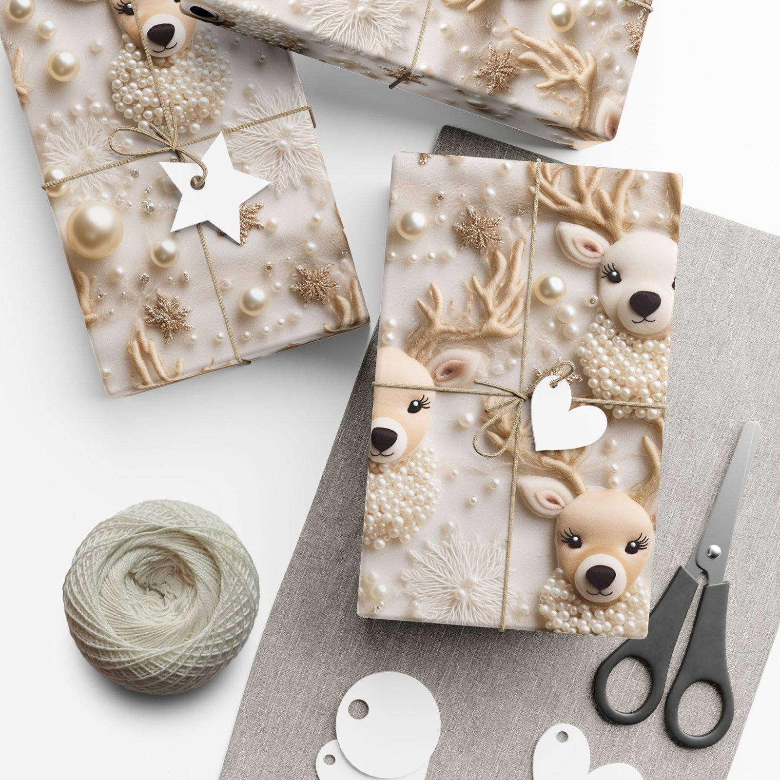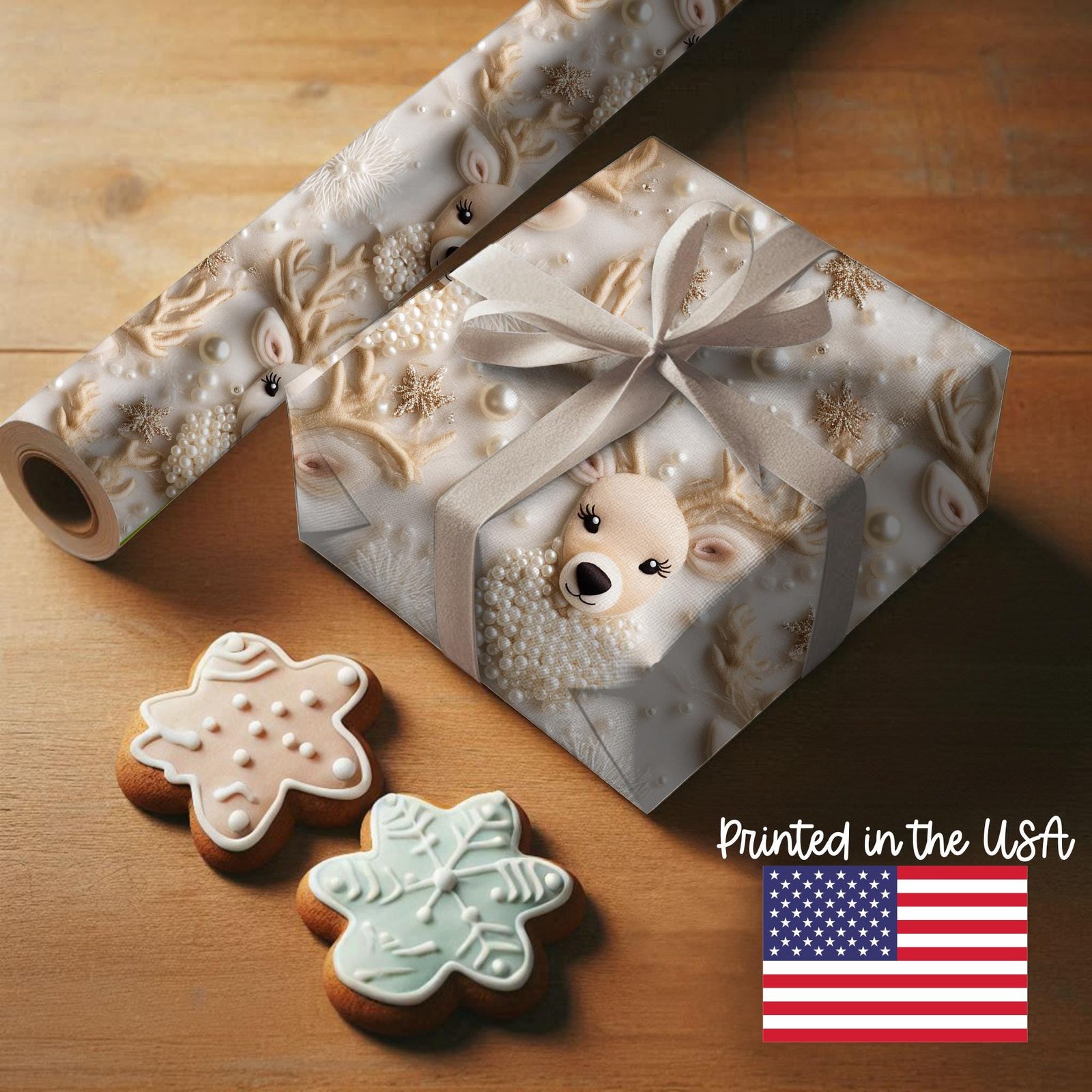 Faux Embroidery Glam Reindeer Wrapping Paper | Luxury Christmas Gift Wrap | Elegant Flat Print Design | Eco-Friendly Holiday Paper