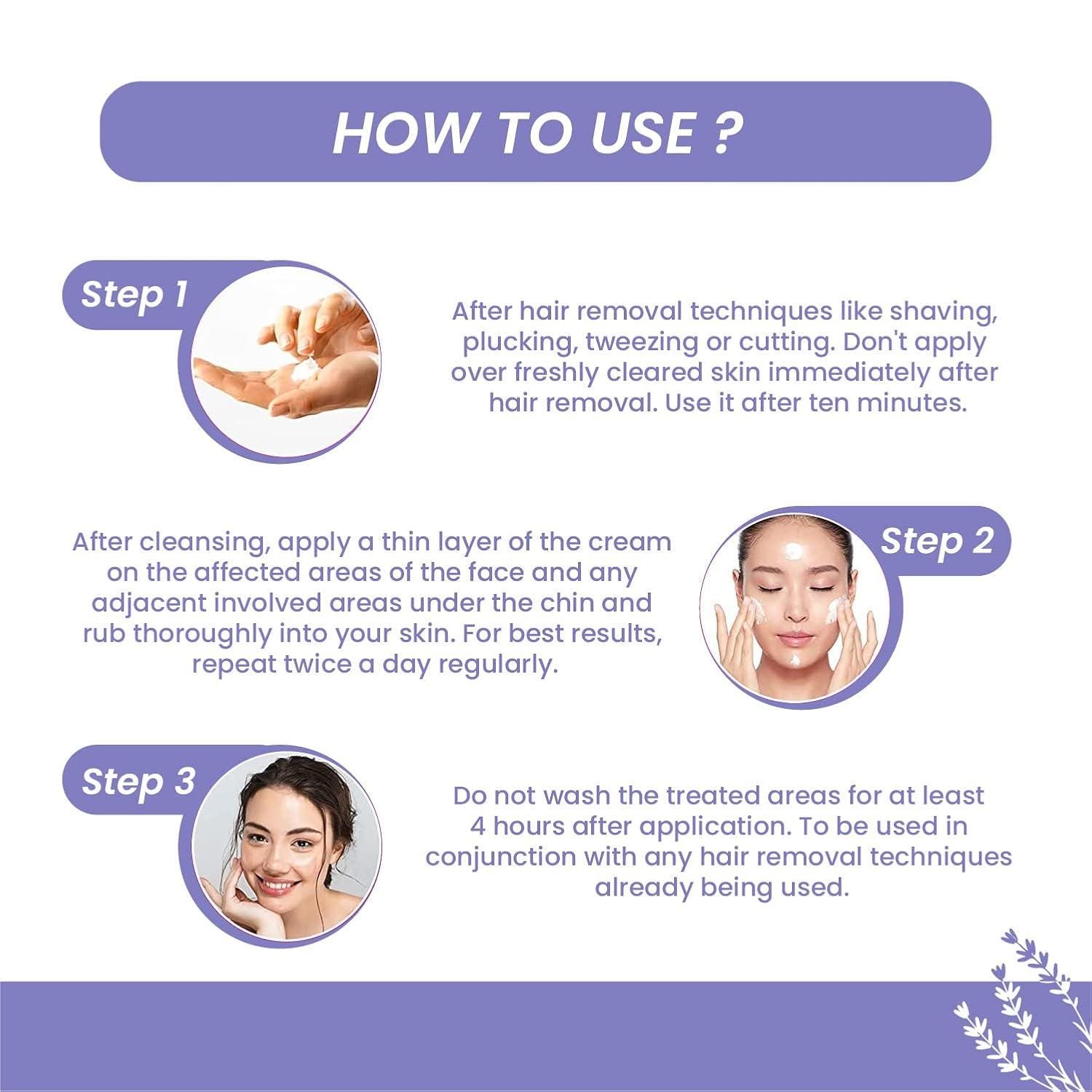 Directions for use: Apply a thin layer of the cream, twice daily on the affected areas of the face and any adjacent involved areas under the chin and rub throughly into your skin. Use it after 10mins of hair removal techniques like shaving, plucking, tweezing or cutting.