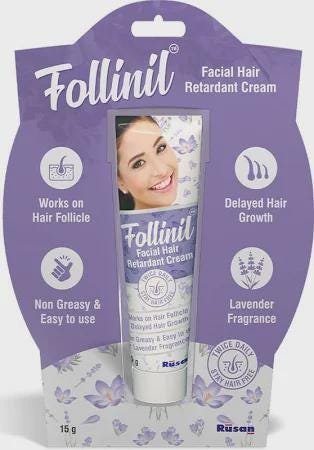 Rusan Follinil Facial Hair Retardant Cream comes into two size Small 15g and Large 30g.