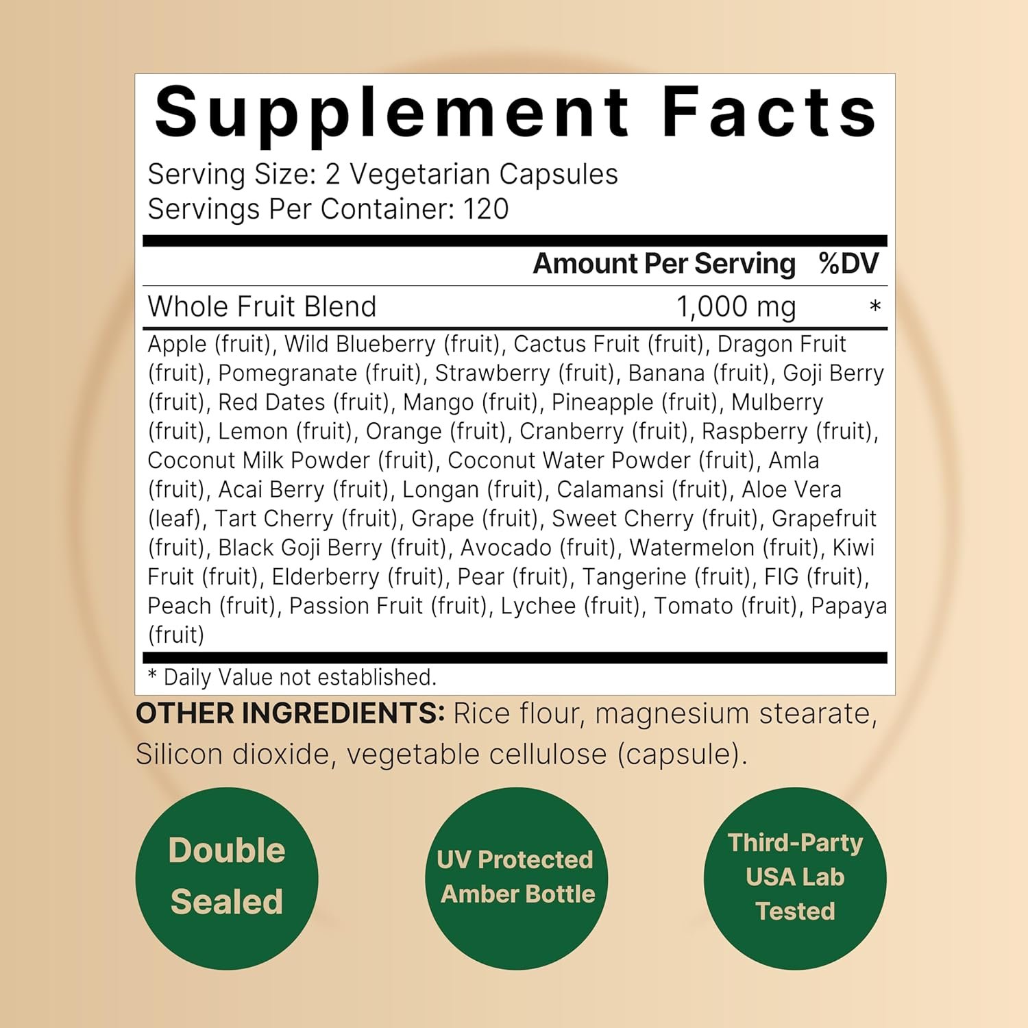 40 Whole Fruit Blend: 240 veggie capsules, 2 capsule serving size, includes fruits like apple, blueberry, cranberry, tart cherry, acai, elderberry, papaya, strawberry, and banana.