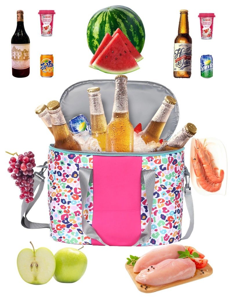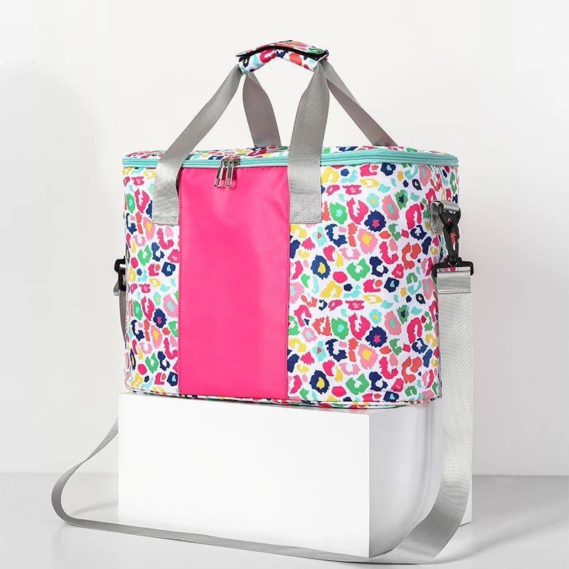 Fun Leopard Monogram Cooler Bag Beach Pool Travel Picnic Personalize colorful animal print pink pack present gift waterproof shoulder strap