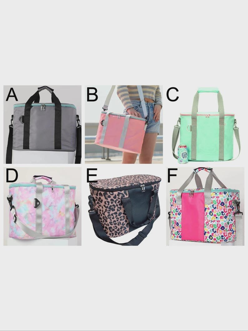 These versatile cooler bags come with an adjustable strap and are perfect for the beach, pool, or traveling! They come in 7 different colors and each color is listed separately! To view other color listings click on the black bold “RagstoRichesMonogram” at the top of the listing. The colors that are listed separately are Leopard, Fun Leopard, Pink, Mint, Gray, Tie Dye, and Cow print. They are oval in shape and measure approximately 16″ x 12″ x 9″. They are made of sturdy waterproof neoprene.