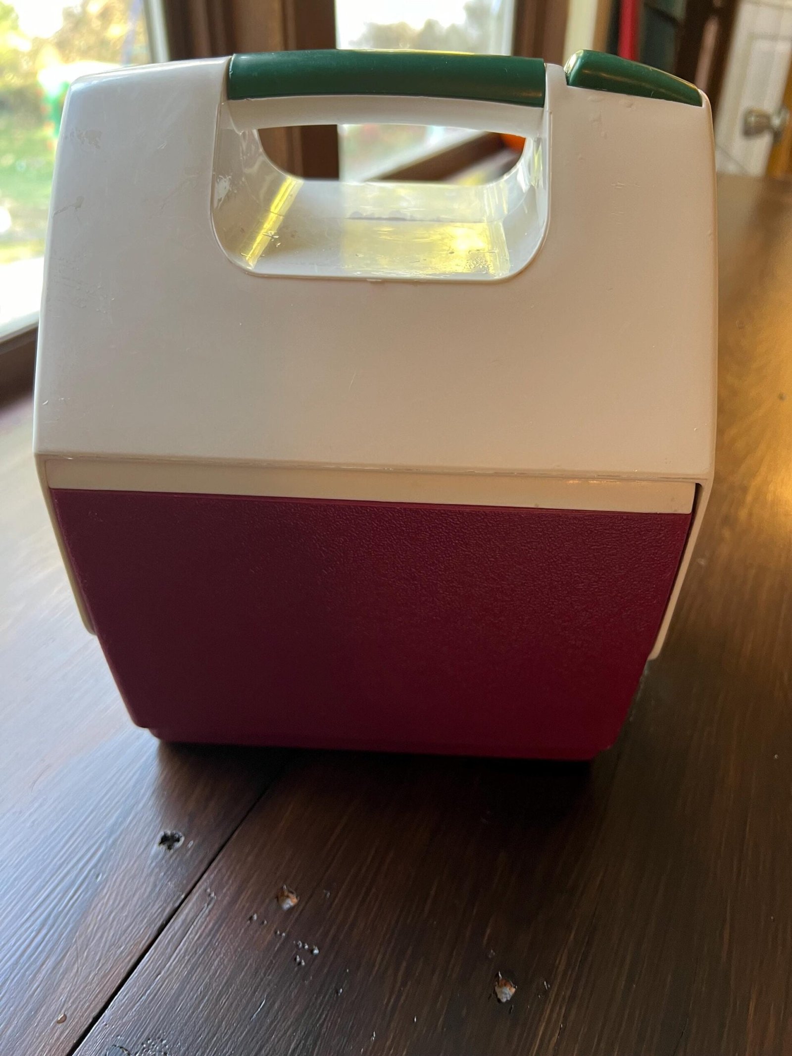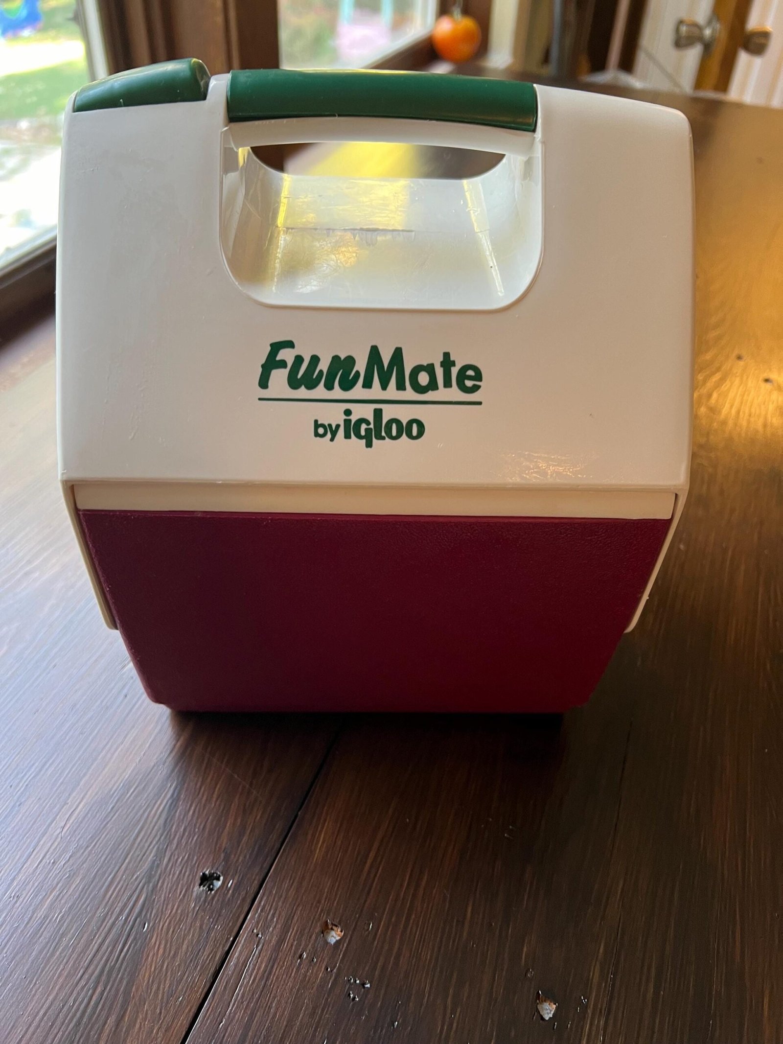 Vintage 1989 FunMate lunchbox size cooler by Igloo. Excellent vintage condition! The main color is that great 80s/90s combo of burgundy and green.