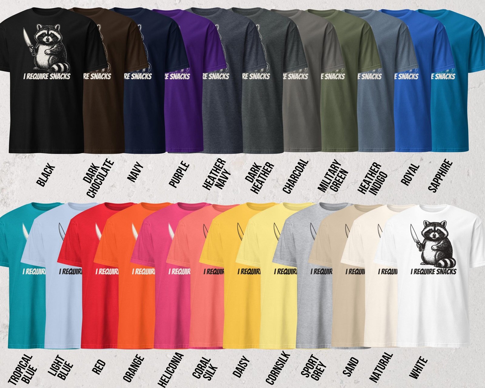 This funny “I Require Snacks” shirt featuring a raccoon with a knife is the ultimate must-have for snack lovers. Perfect for movie nights, parties, or as a hilarious gift for friends and family.