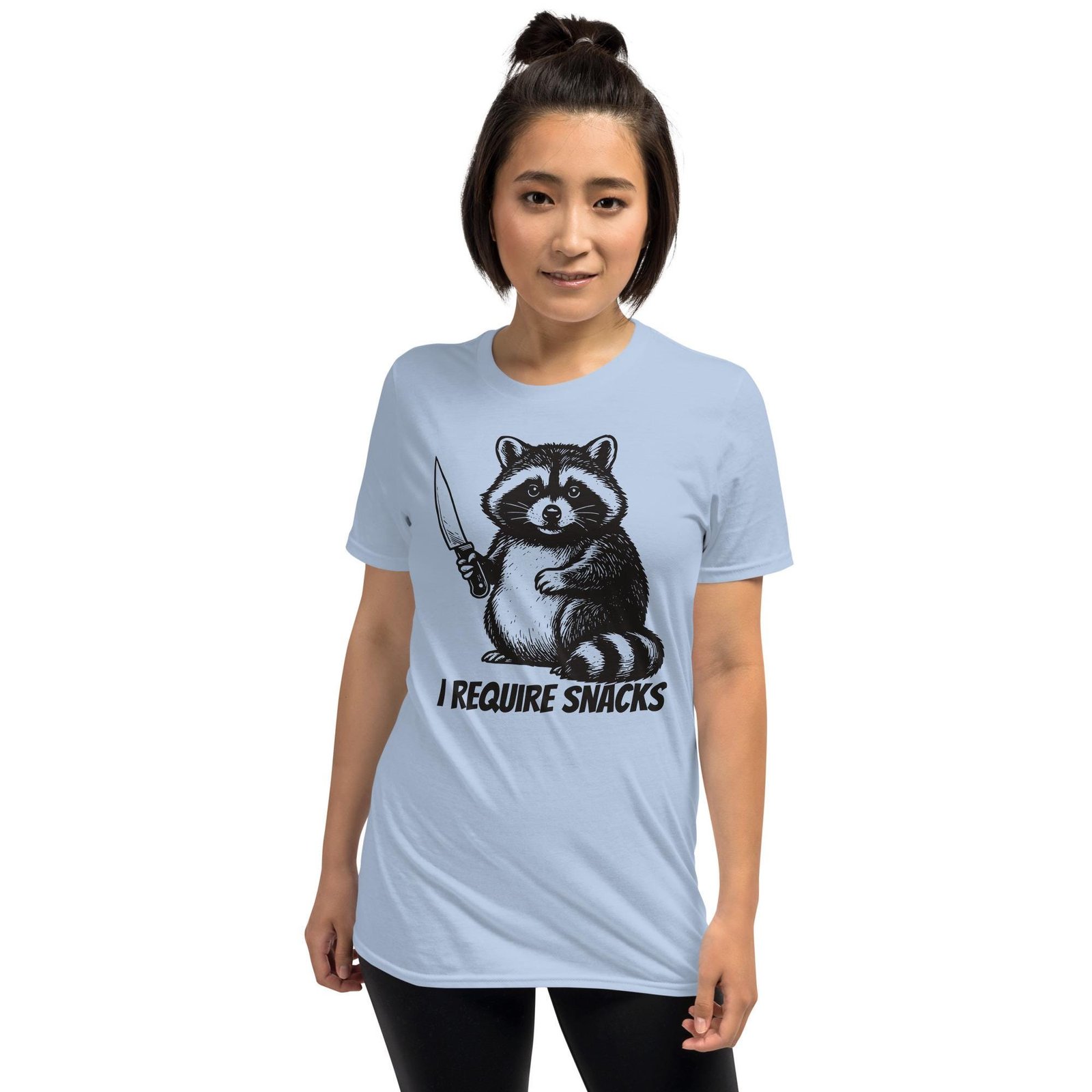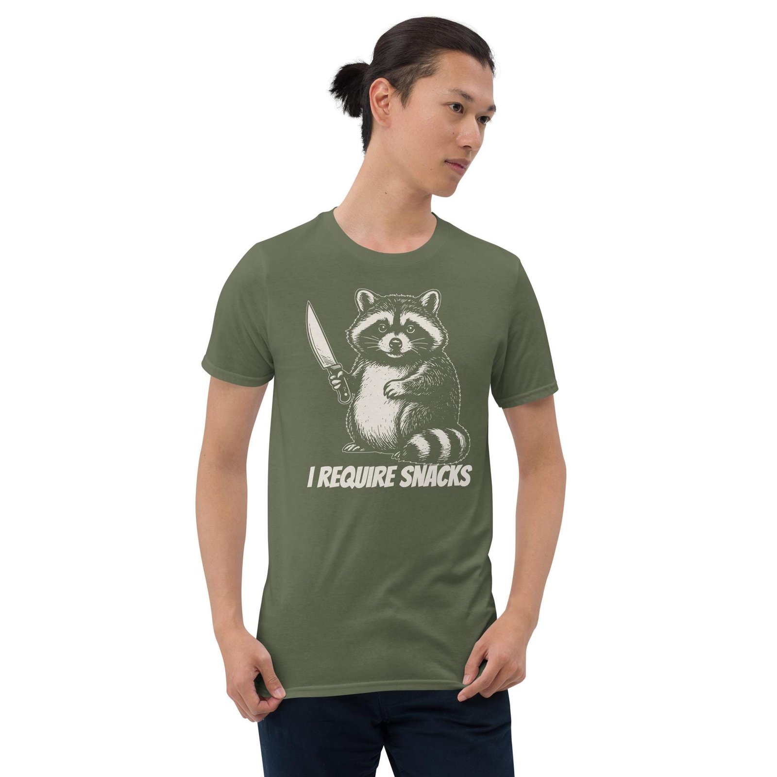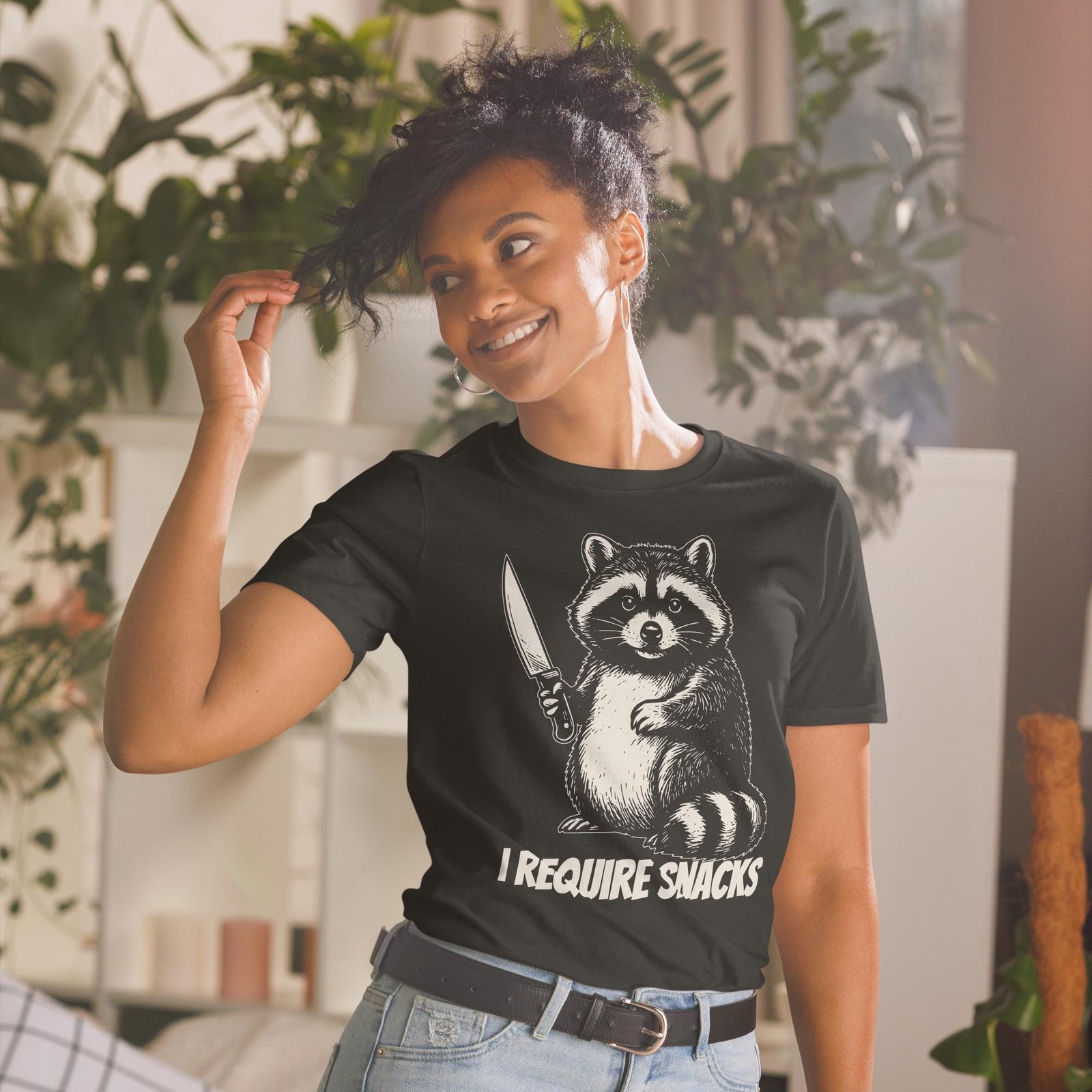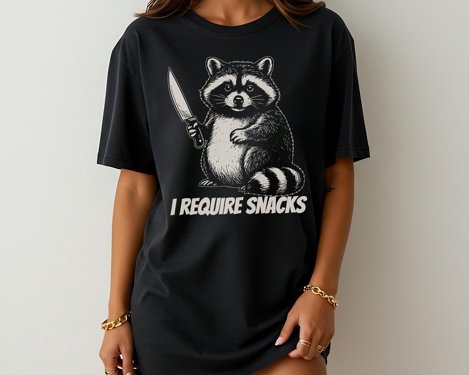 Funny Raccoon T-Shirt | I Require Snacks Trash Panda Meme Shirt | Hilarious Snack Lover Gift Idea for Foodie Girlfriend | Her Food Humor Tee
