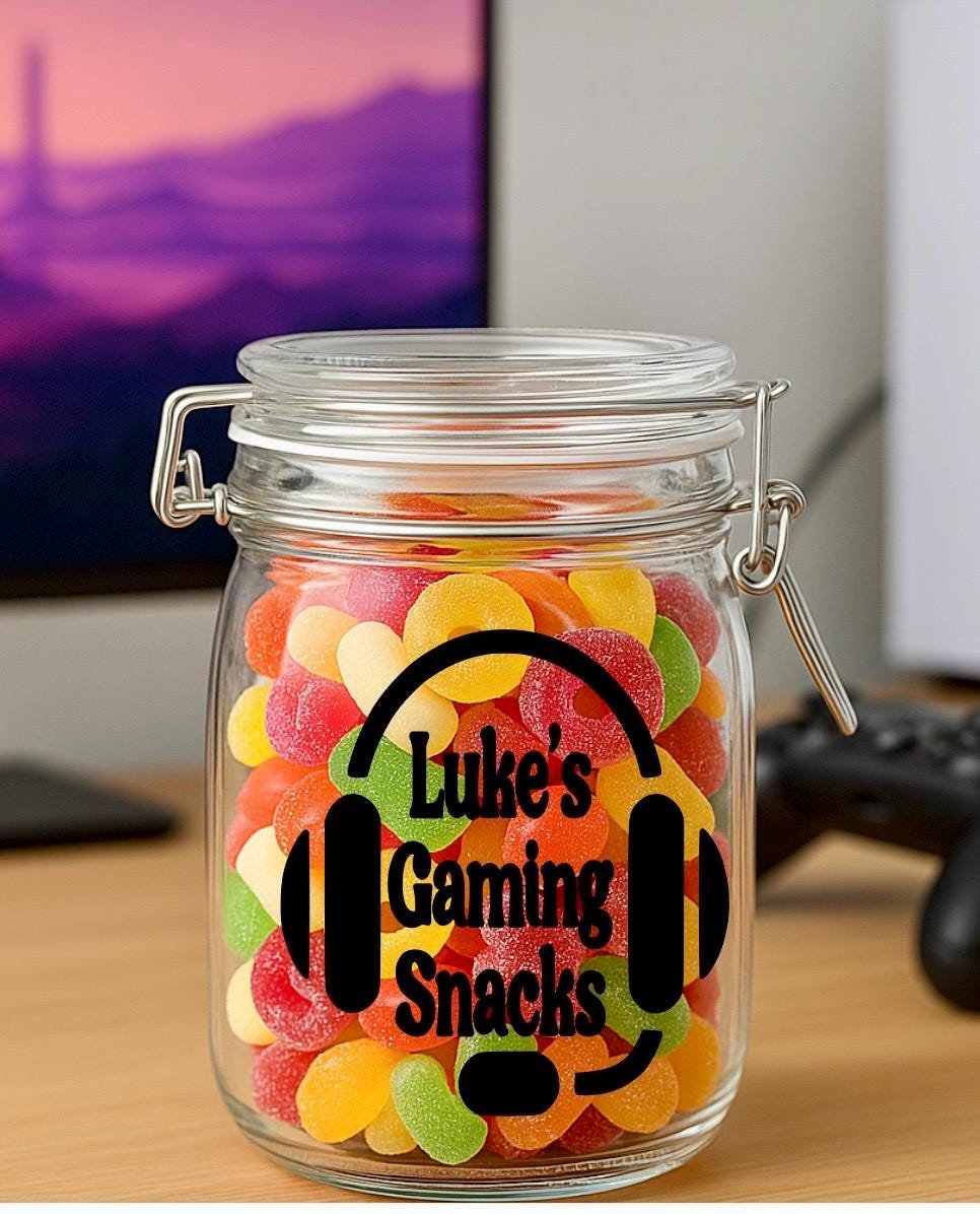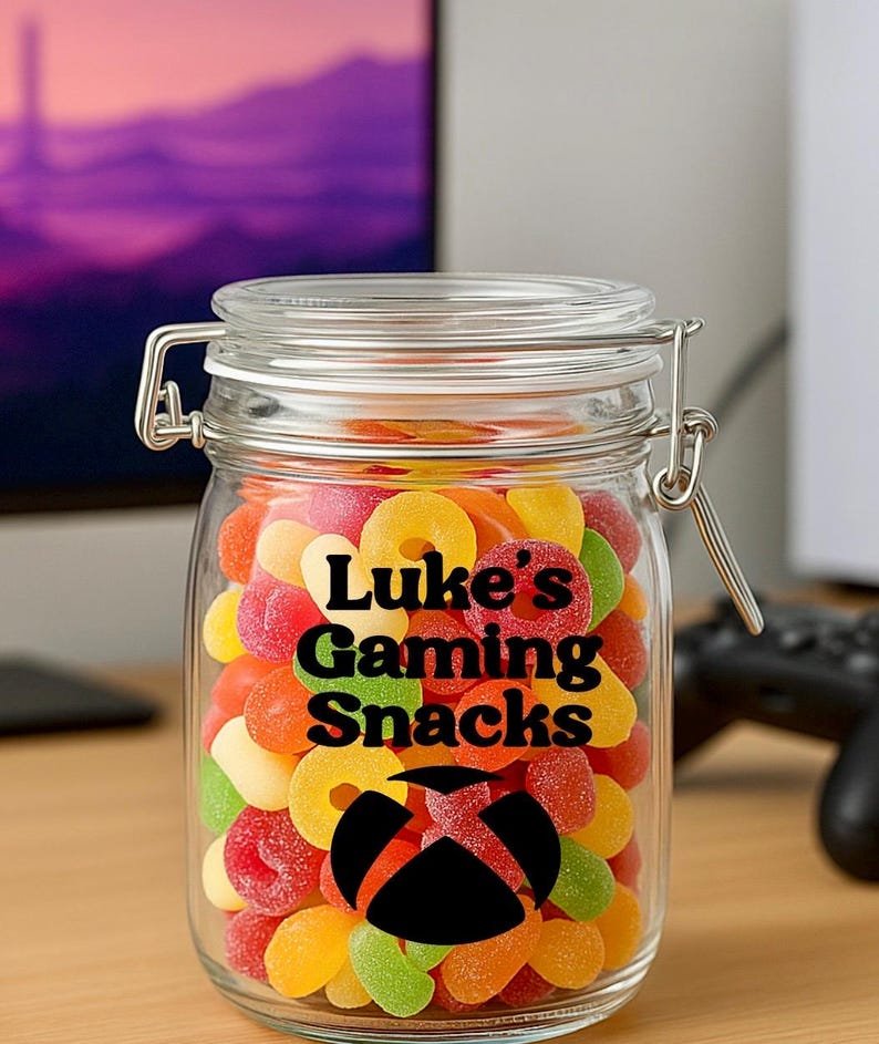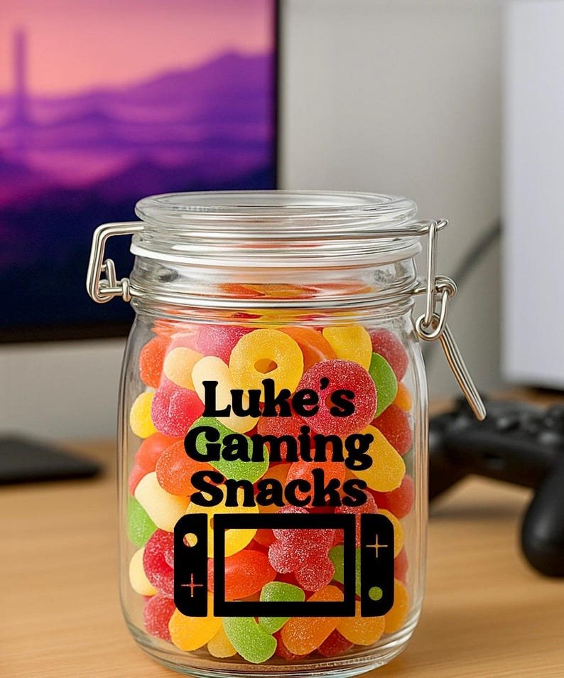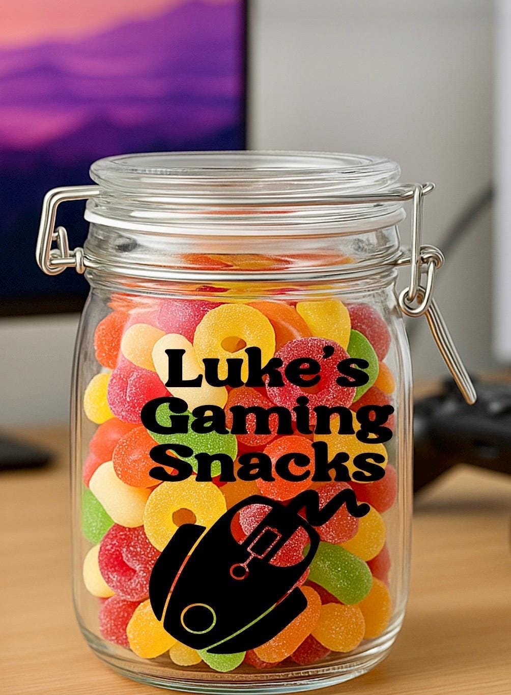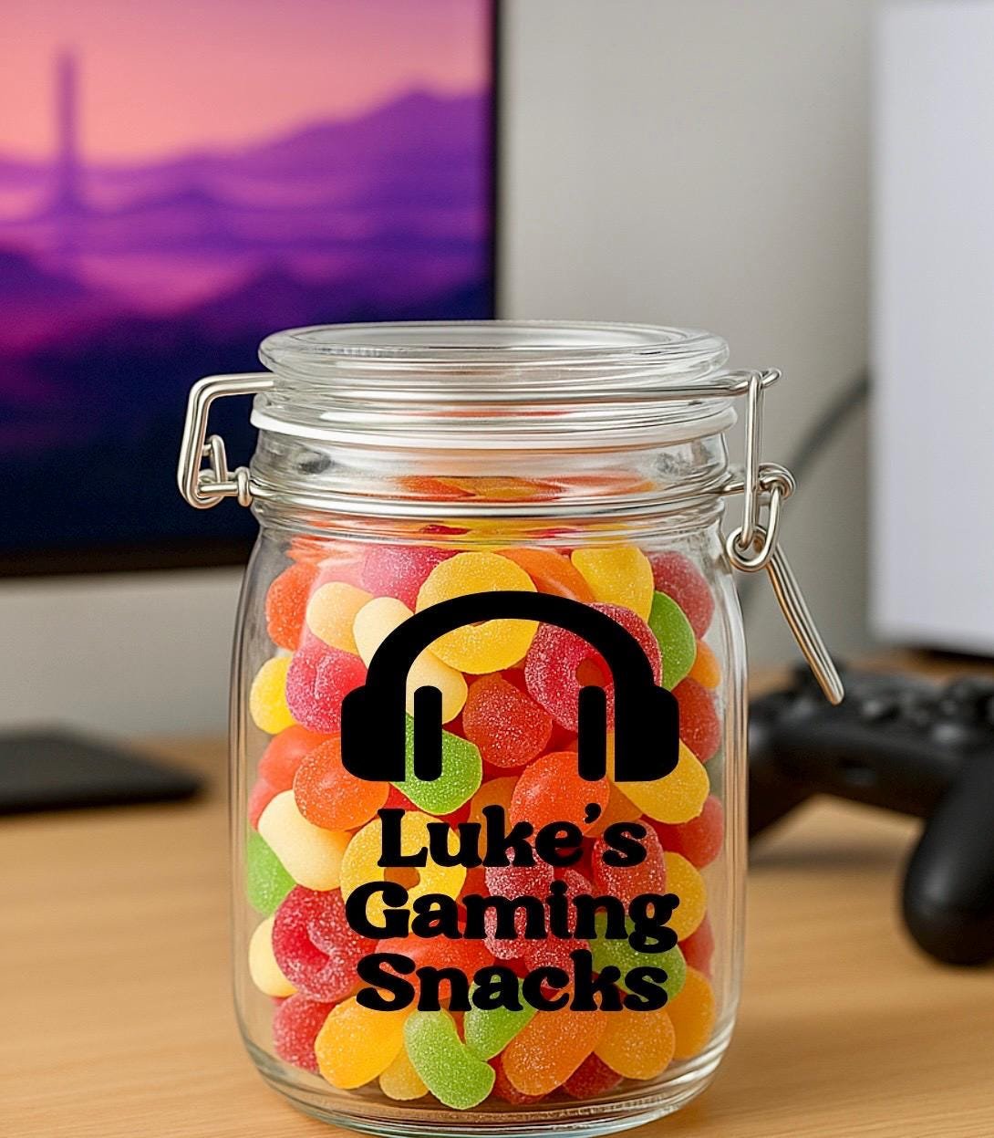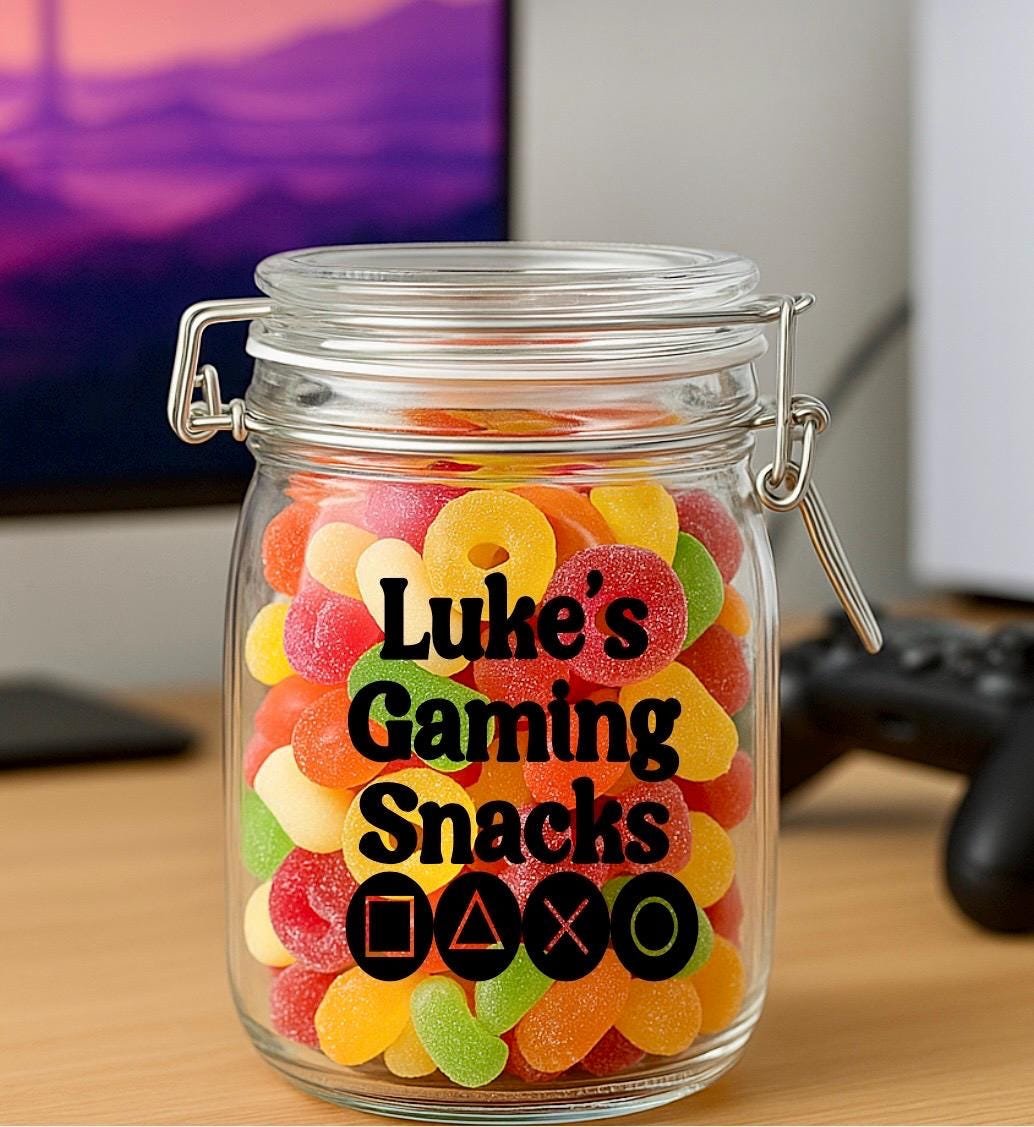 Make snack time legendary with this personalised gaming snack jar sticker — the perfect touch for gamer birthdays, party favours, or kids’ room decor!
