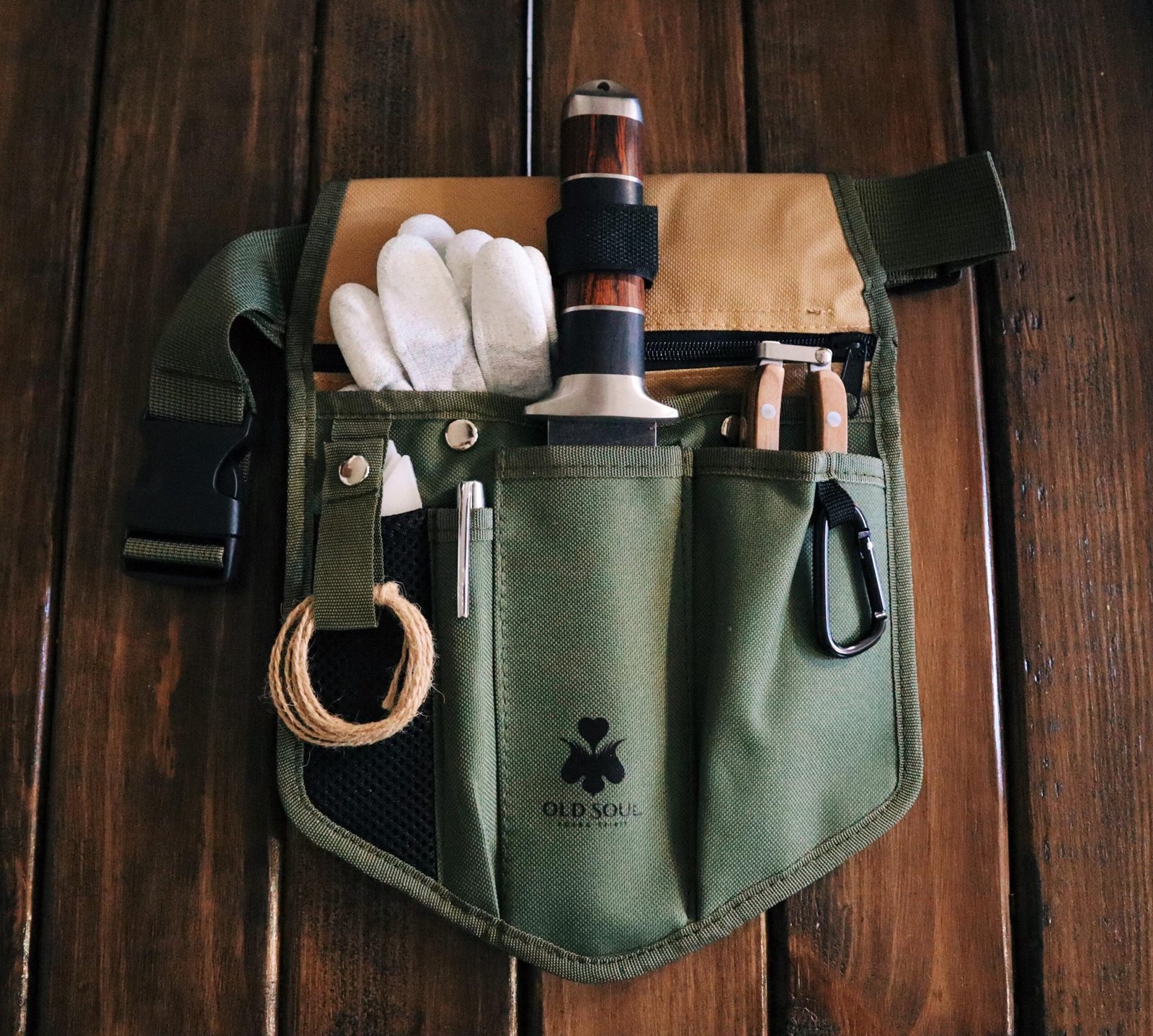 Please note: This bag was designed around the tools I offer on my Etsy shop, other tools may fit but there is no guarantee with other brand tools. As mentioned above, two sleeves are lined with ripstop material meant for sharp objects Old Soul Young Spirit Hori Hori and Pruner sleeves. The other sleeves are for other items such as gloves, notepads or sheathed tools only. The shell material is Oxford 600d and is a great material and meant to hold up to the weather but is not meant to hold up to sharp edges whereas the ripstop lining material is.
