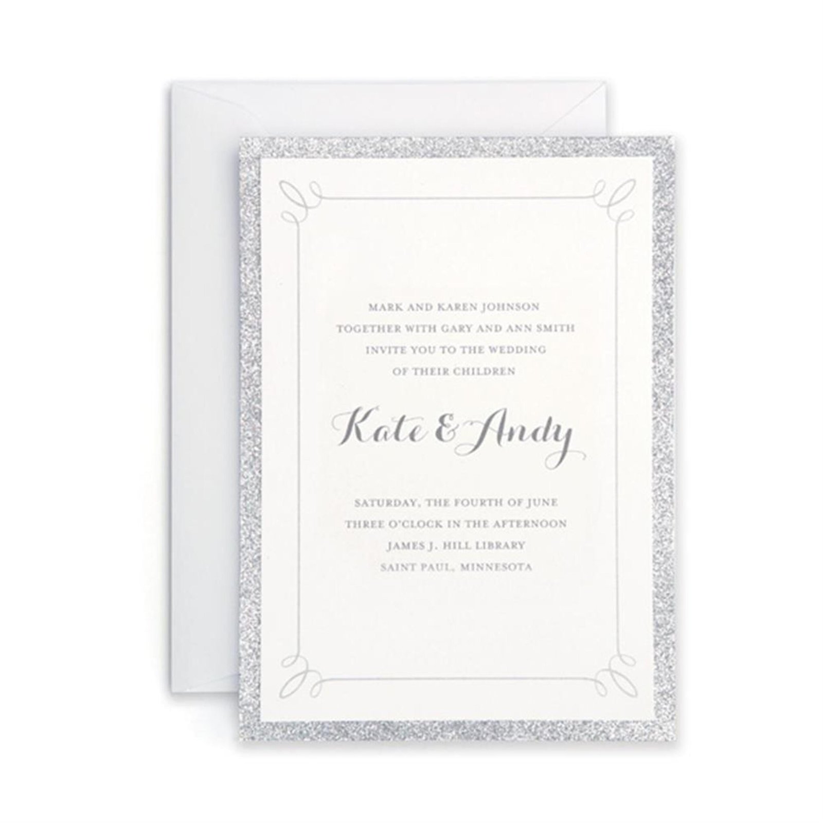 - Invitations with a silver-glitter foil design on heavyweight paperstock with coordinating heavyweight envelopes are ideal for formal correspondence.