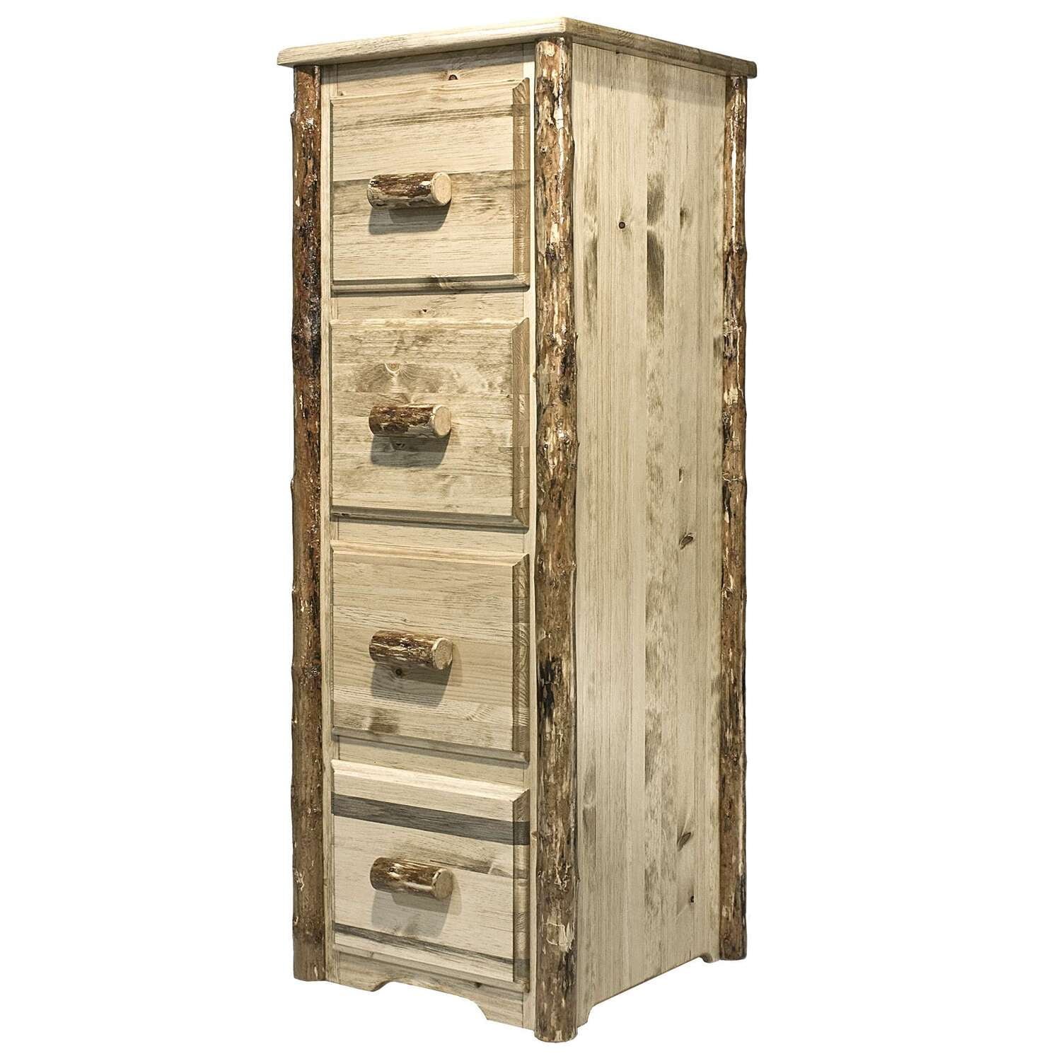This ruggedly beautiful four drawer file cabinet nicely compliments the matching Montana Woodworks® desks, sold separately. Increase the ease of filing chores while adding rustic style and distinction to your home or office. This unit may also be used as a deep drawer, four drawer dresser. Handcrafted with solid, American grown wood, with genuine lodge pole pine accents, this file cabinet features full extension, ball bearing slides on each of the four letter sized file drawers. Finished in the “Glacier Country” collection style for a truly unique, one-of-a-kind look reminiscent of the Grand Lodges of the Rockies, circa 1900. First we remove the outer bark while leaving the inner, cambium layer intact for texture and contrast. Then the finish is completed in an eight step, professional spraying process that applies stain and lacquer for a beautiful, long lasting finish. Comes fully assembled. 20-year limited warranty included at no additional charge.
