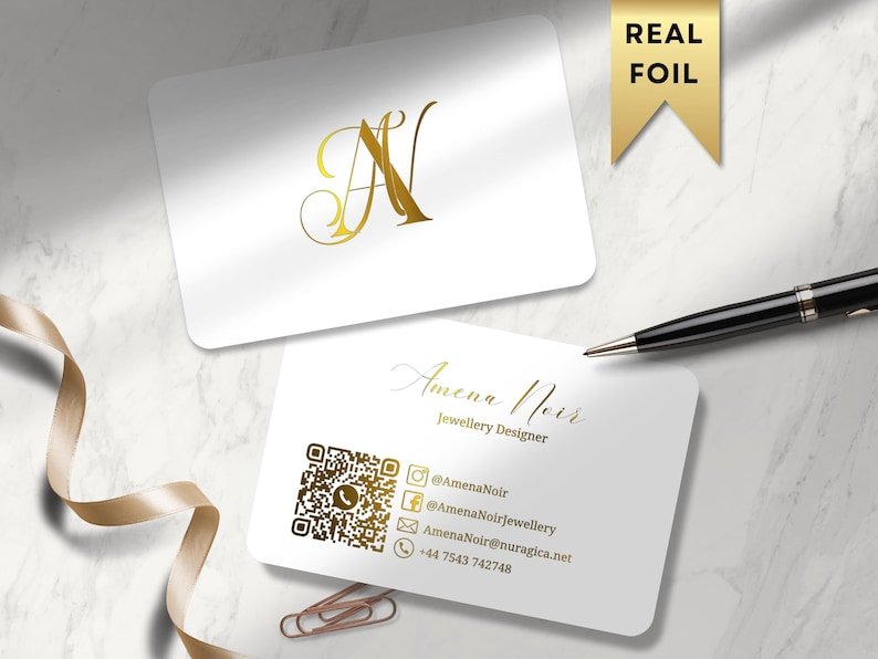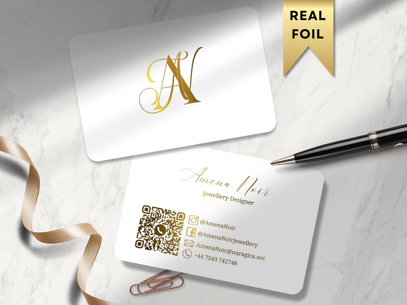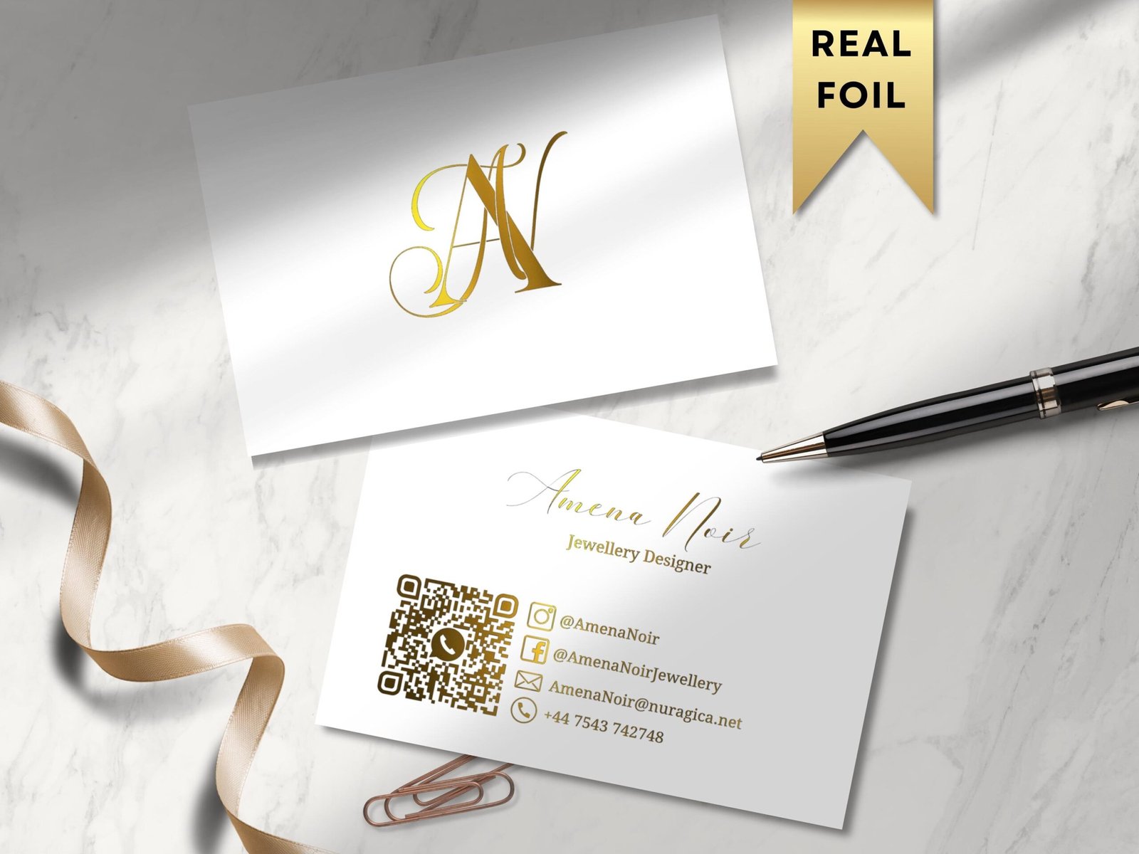 Make a lasting impression with premium double-sided business cards featuring real gold foil on thick 400gsm cardstock. With your logo on the front and all essential contact info plus a smart QR code on the back, these cards are the perfect blend of style and function.