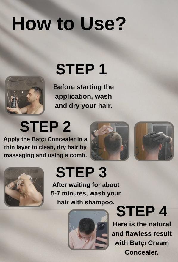Step 1: Batçı Hair Concealer needs to be applied to clean hair for lasting results. Therefore, in the first step, you should use Batçı Shampoo, which is sulfate-free, paraben-free, and menthol-free.