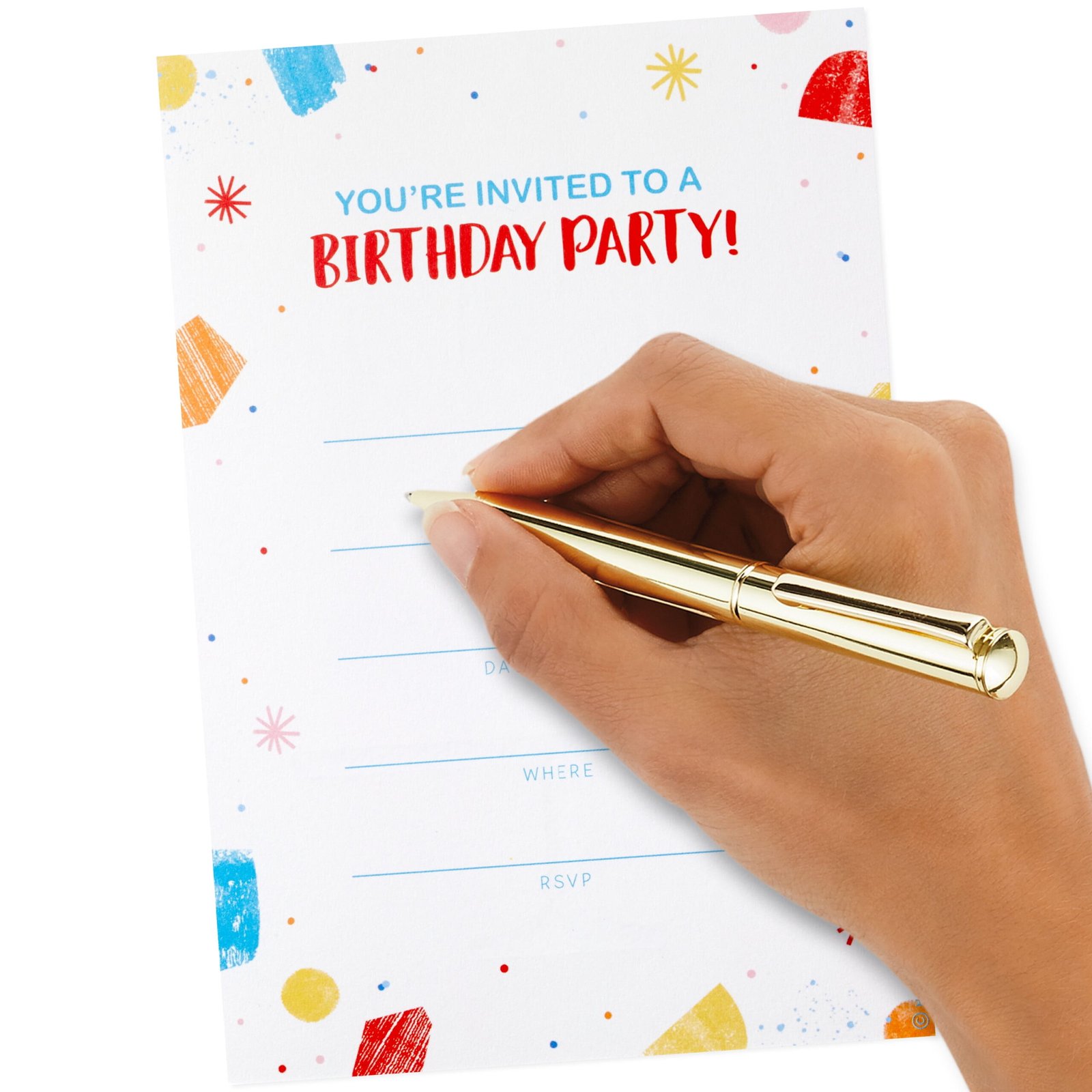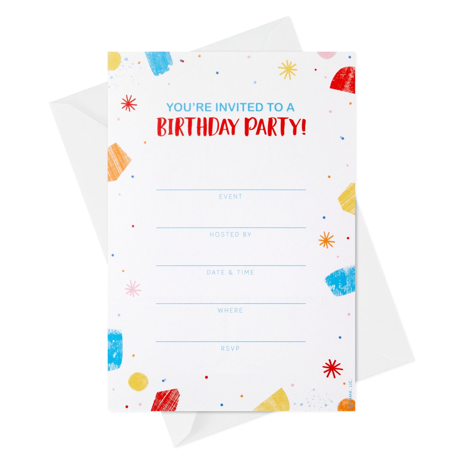 Invite friends and family to a birthday party with this colorful set of invitations from Hallmark. Single-panel invites feature a birthday cake design perfect for any age. The Hallmark brand is widely recognized as the very best for greeting cards, gift wrap, and more. For more than 100 years, Hallmark has been helping its customers make everyday moments more beautiful and celebrations more joyful.
