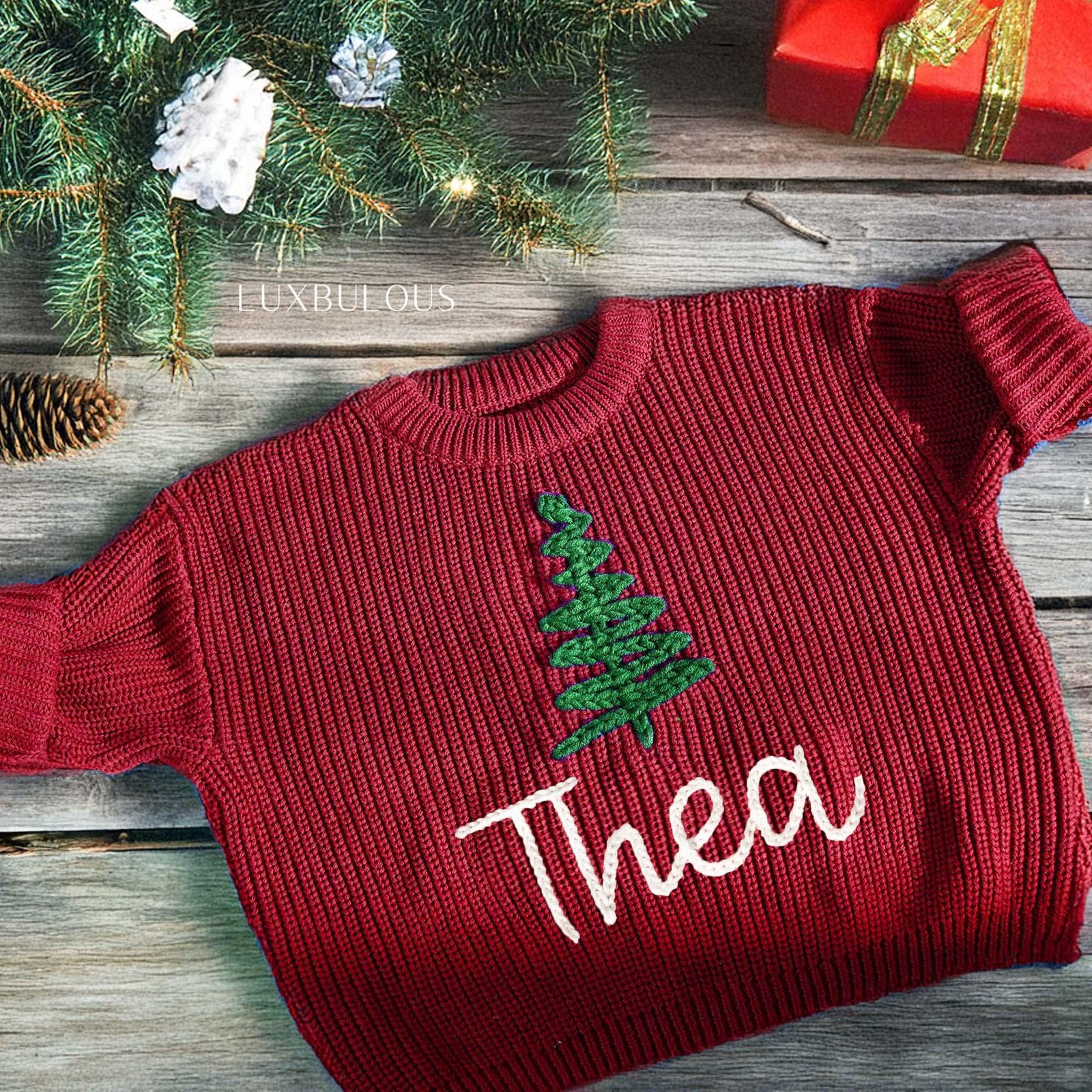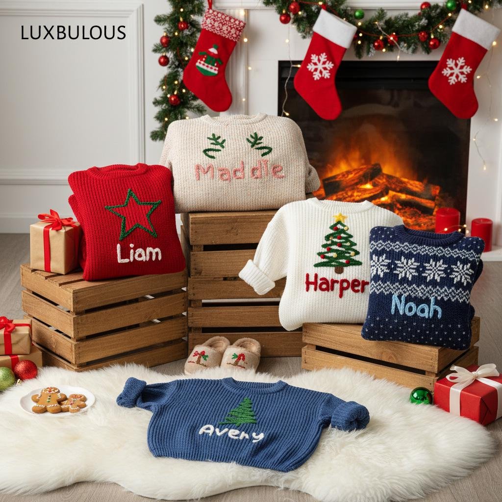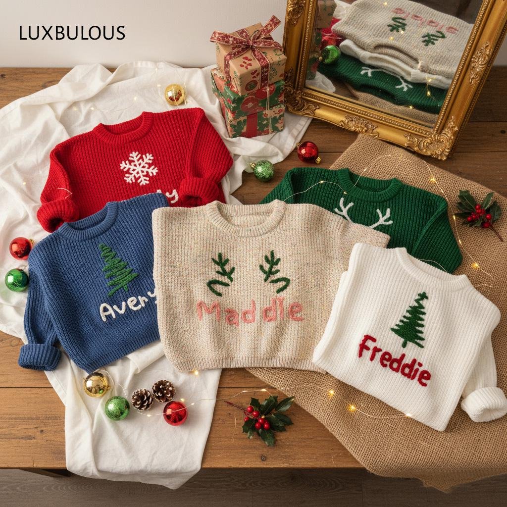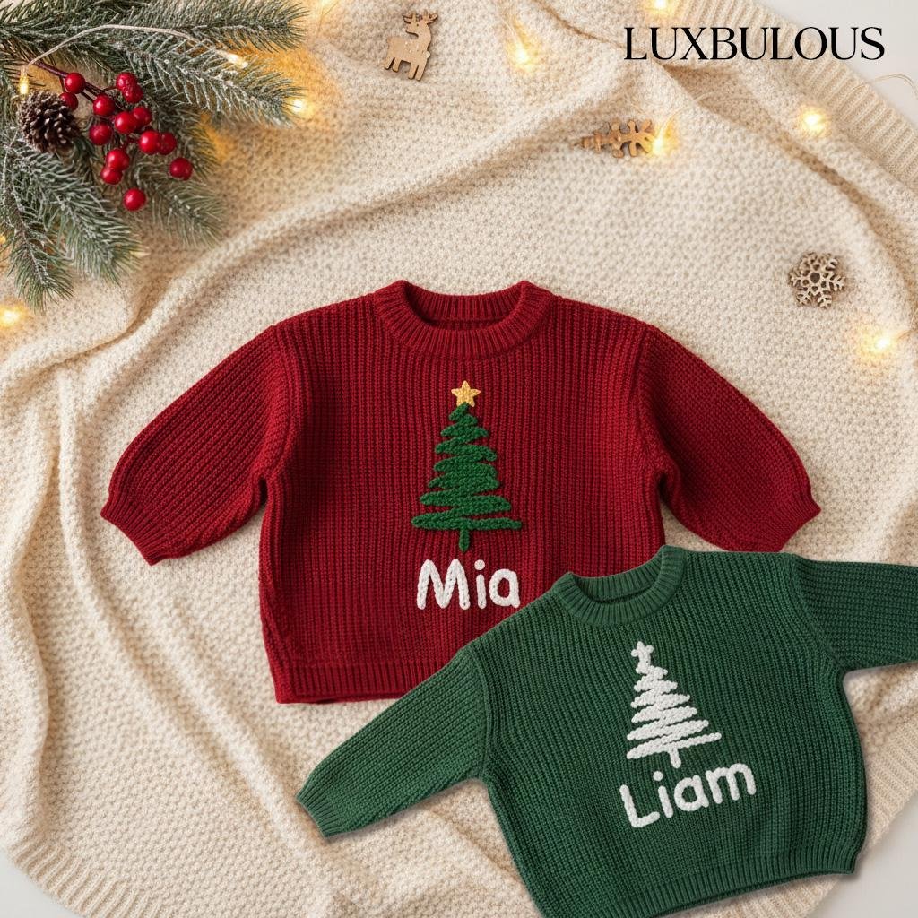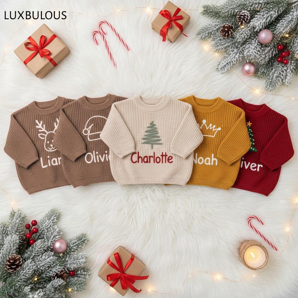 Hand-Embroidered Baby Christmas Sweater, Toddler Holiday Sweater, Reindeer Kids Name Jumper, Baby Knit Sweater, First Christmas Gifs-DE