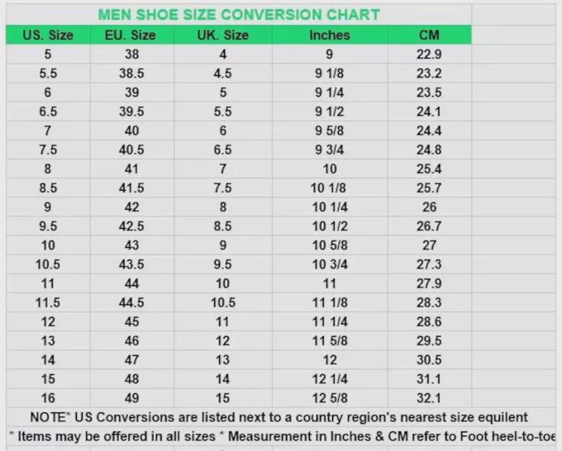 5 US men's ,6 US men's ,5.5 US men's ,6.5 US men's ,7 US men's ,7.5 US men's ,8 US men's ,8.5 US men's ,9 US men's ,9.5 US men's ,10 US men's ,10.5 US men's ,11 US men's ,11.5 US men's ,12 US men's ,12.5 US men's ,13 US men's ,13.5 US men's ,14 US men's ,14.5 US men's ,15 US men's ,15.5 US men's ,16 US men's |