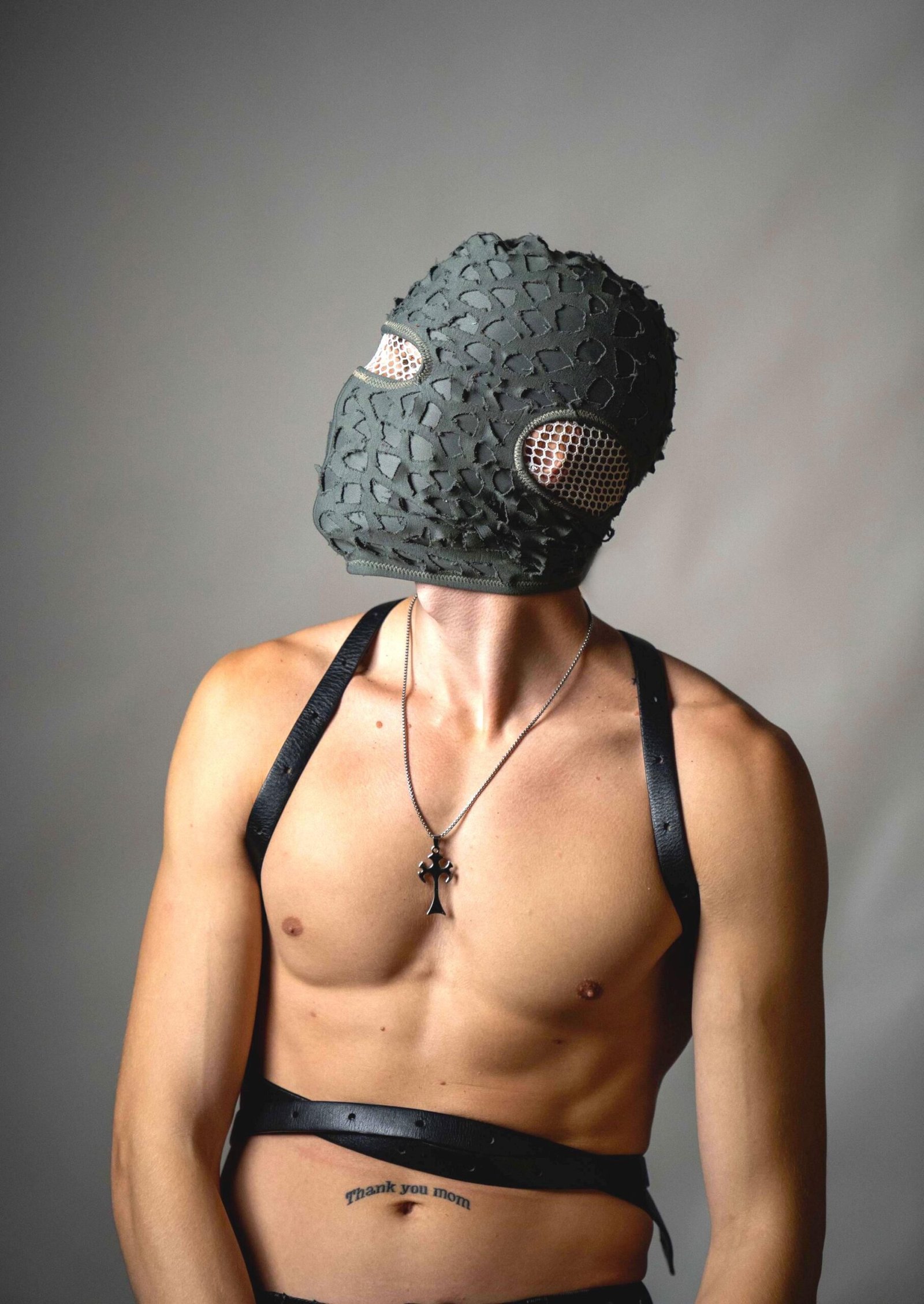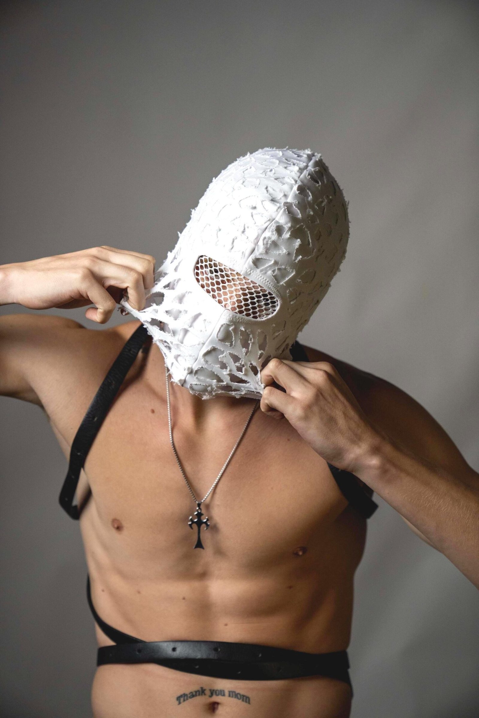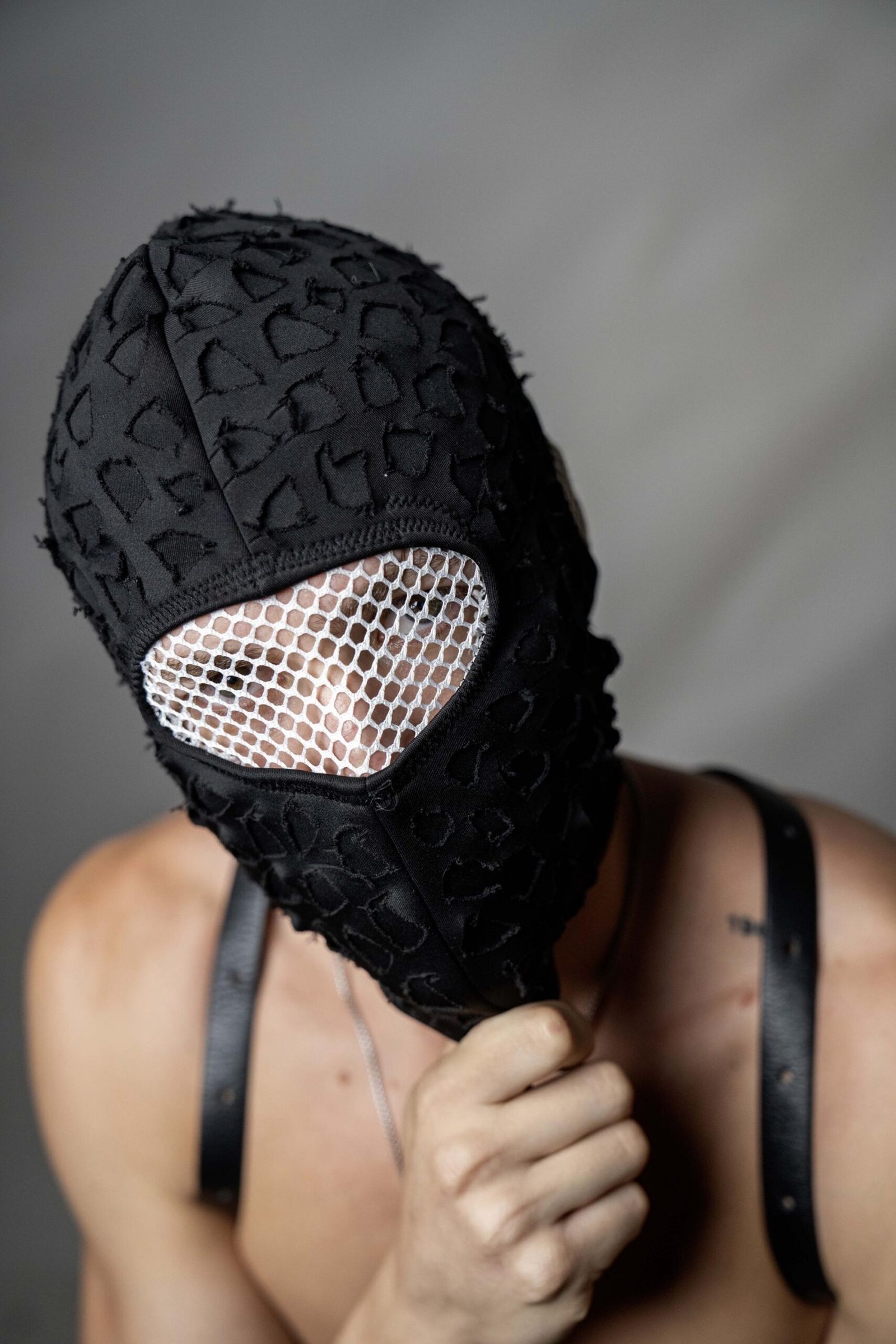 Handmade balaclava ski mask, torn and tattered, shabby tacky cotton ragged full face cover and protector Fragmented, unisex, all ages