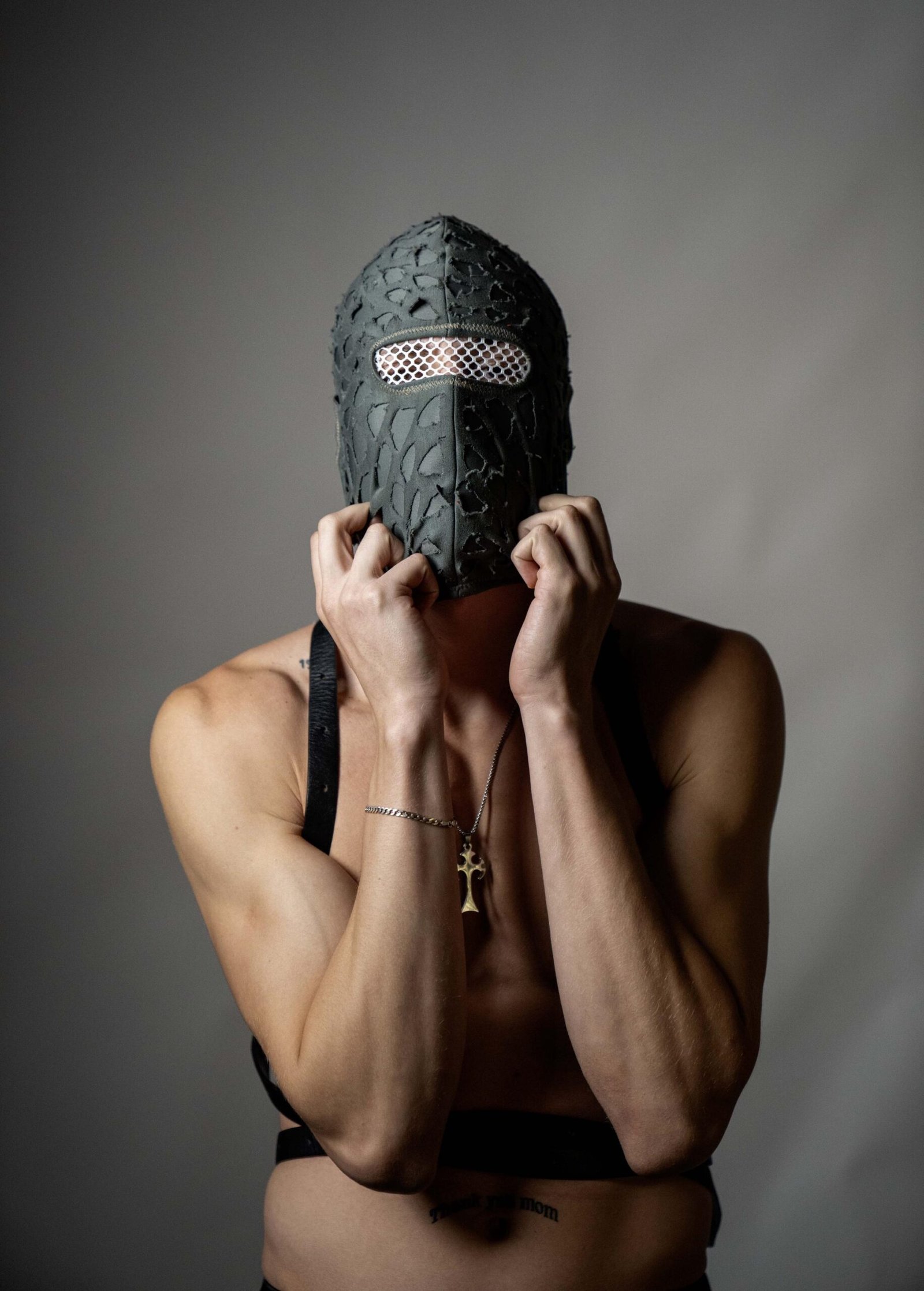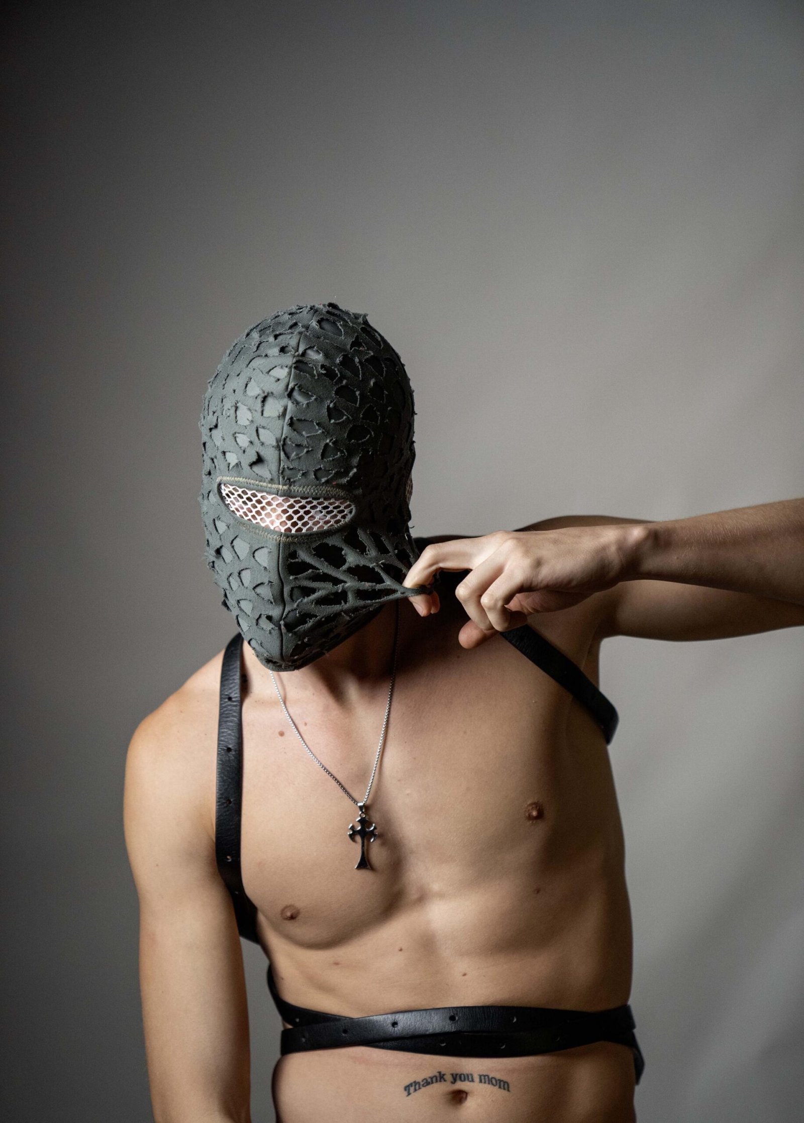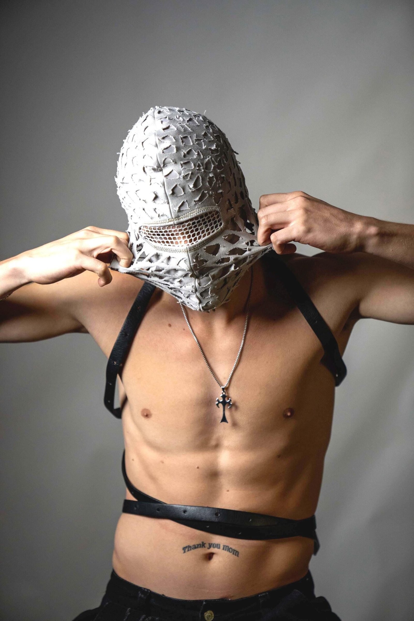 Handmade balaclava ski mask, torn and tattered, shabby tacky cotton ragged full face cover and protector Fragmented, unisex, all ages