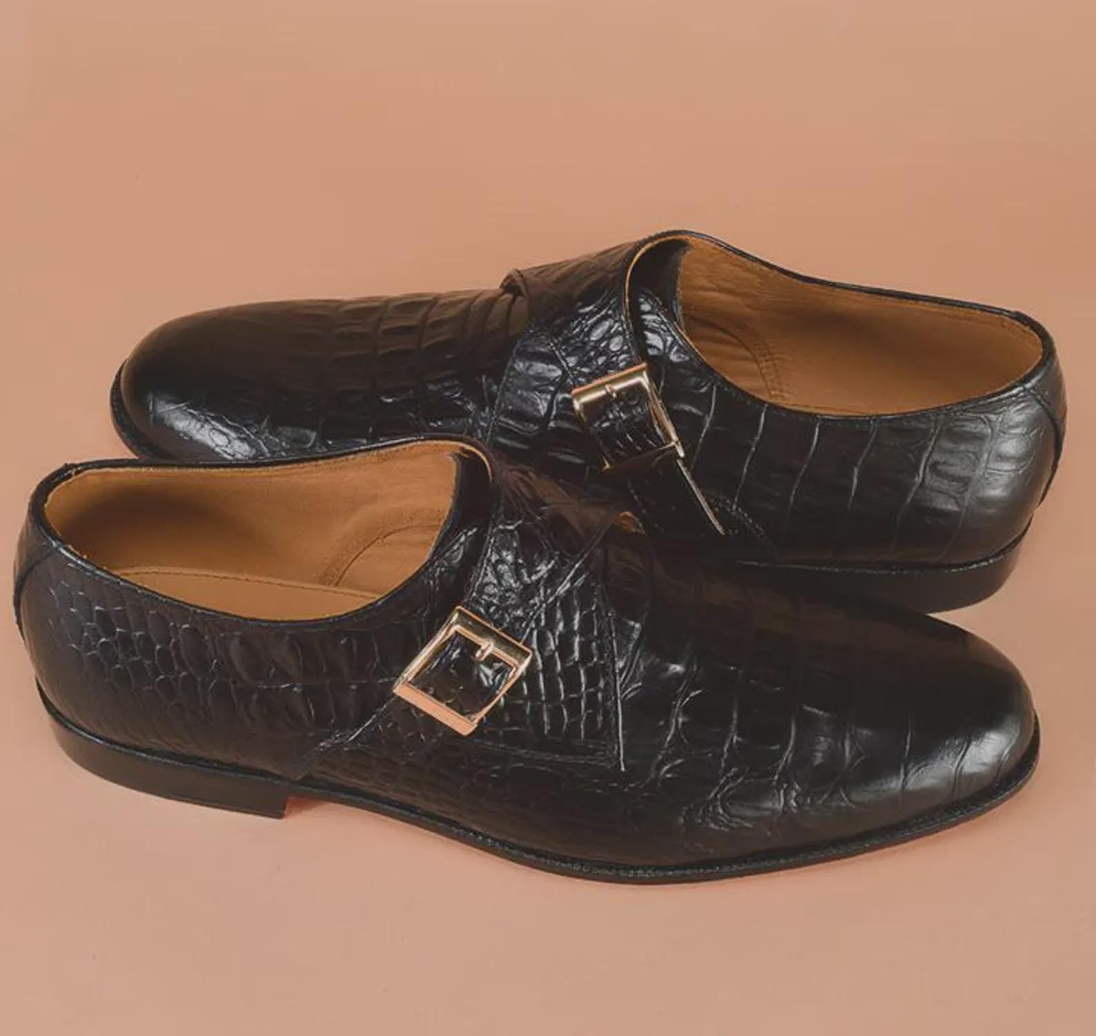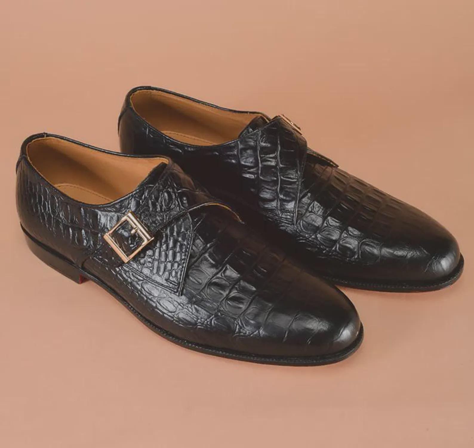 Handmade Black Alligator Crocodile Men's Leather Single Monk Strap Dress Shoes