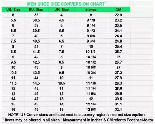 6 US men's ,6.5 US men's ,7 US men's ,7.5 US men's ,8 US men's ,8.5 US men's ,9 US men's ,9.5 US men's ,10 US men's ,10.5 US men's ,11 US men's ,11.5 US men's ,12 US men's ,12.5 US men's ,13 US men's |