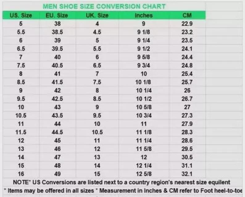 6 US men's ,6.5 US men's ,7 US men's ,7.5 US men's ,8 US men's ,8.5 US men's ,9 US men's ,9.5 US men's ,10 US men's ,10.5 US men's ,11 US men's ,11.5 US men's ,12 US men's ,12.5 US men's ,13 US men's ,13.5 US men's ,14 US men's |