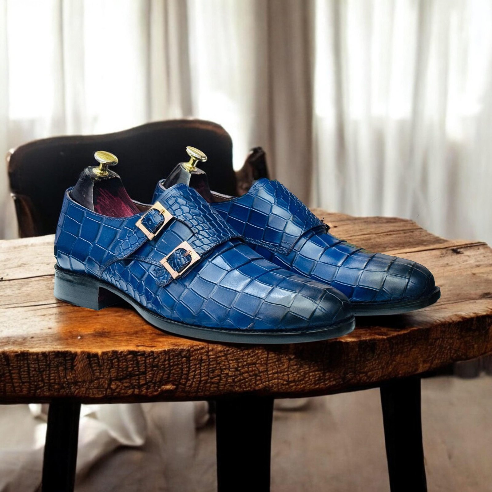 The blue alligator-textured leather gives these shoes a unique and polished look, making them ideal for both formal and semi-formal occasions. The double monk strap adds an extra touch of class, ensuring you stand out at any event.