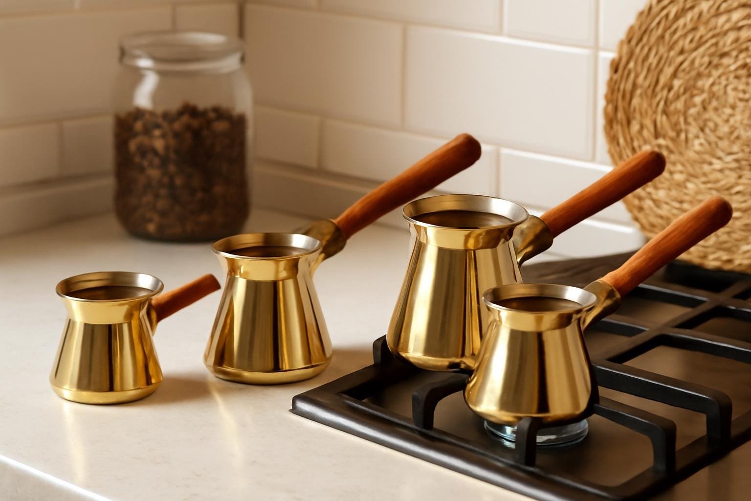 Handmade Brass Coffee Pot Set of 4 – Traditional Coffee Maker, Vintage Coffee Pots, Brass Kitchenware, Serving Set & Coffee Lovers Gift