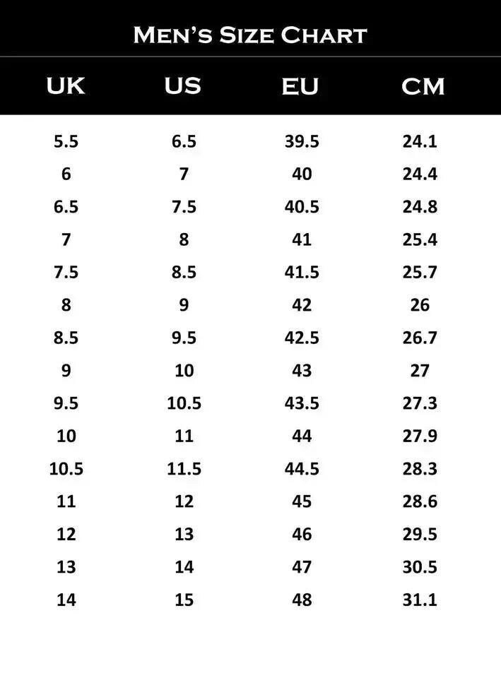 6 US men's ,6.5 US men's ,7 US men's ,7.5 US men's ,8 US men's ,8.5 US men's ,9 US men's ,9.5 US men's ,10 US men's ,10.5 US men's ,11 US men's ,11.5 US men's ,12 US men's ,12.5 US men's ,13 US men's ,13.5 US men's ,14 US men's ,14.5 US men's ,15 US men's |