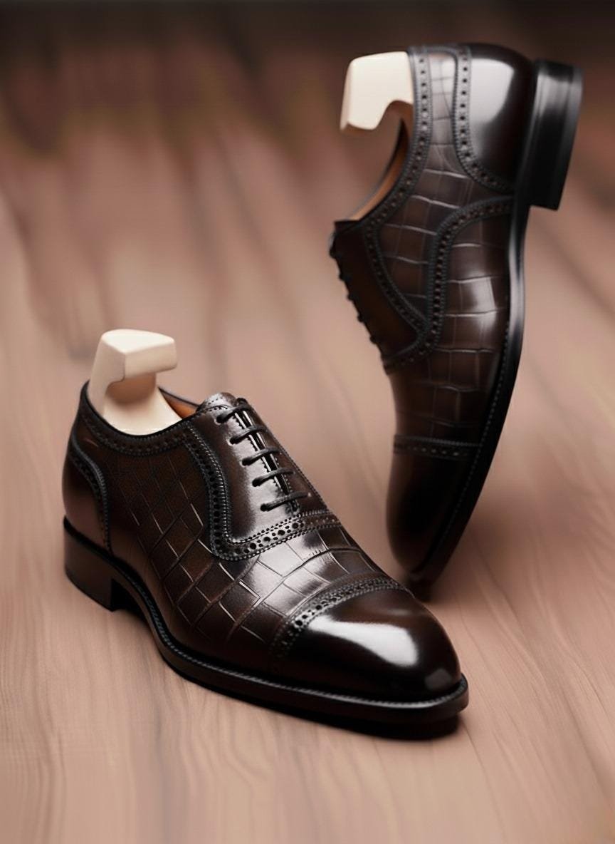 Upgrade your style with these luxury handmade Brown Oxford Dress Shoes for Men, crafted for buyers who want premium quality, timeless elegance, and long-lasting comfort. Designed with a polished cap toe, detailed brogue accents, and a unique crocodile-pattern texture, these shoes give you the perfect blend of modern sophistication and classic formal style.