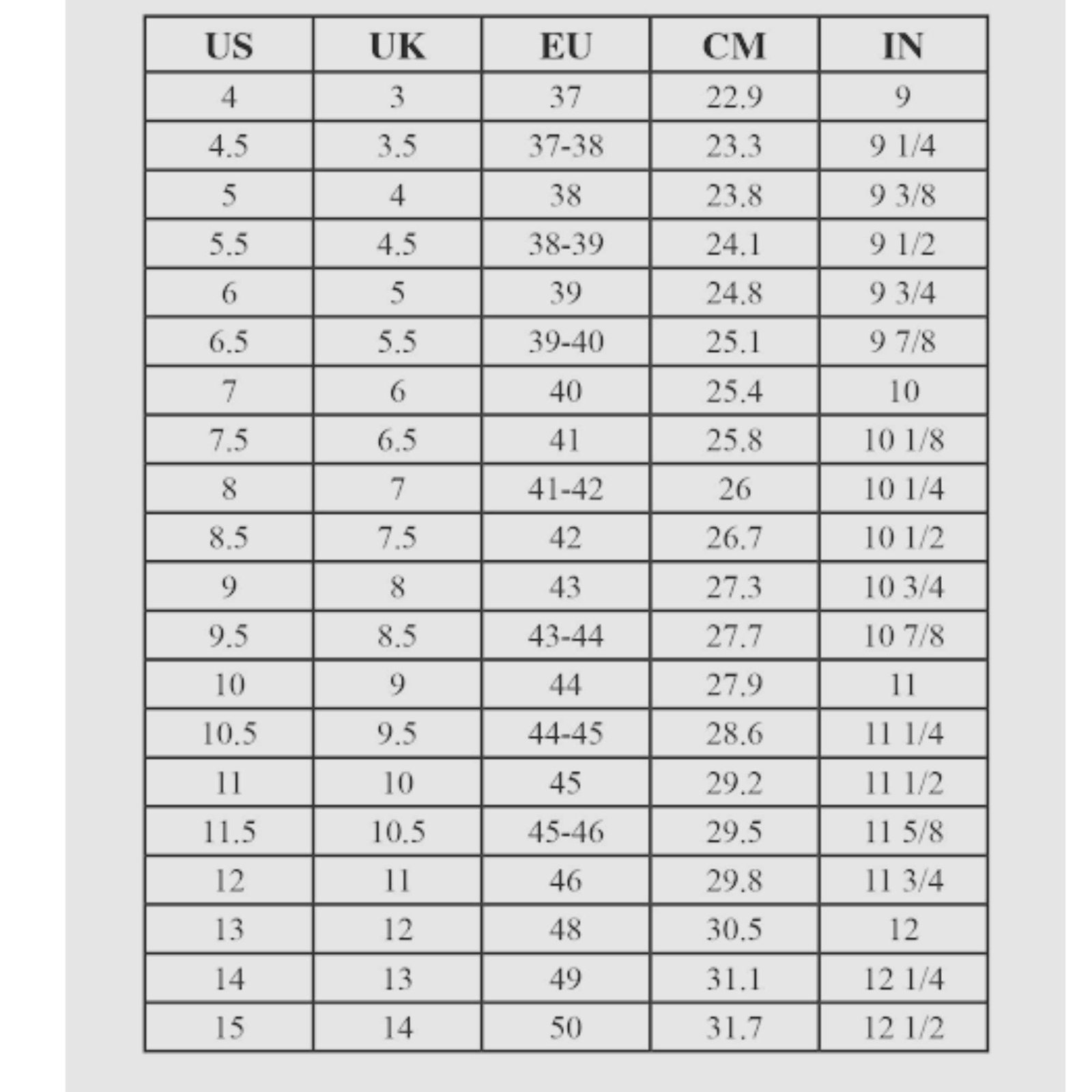 5 US men's ,5.5 US men's ,6 US men's ,6.5 US men's ,7 US men's ,7.5 US men's ,8 US men's ,8.5 US men's ,9 US men's ,9.5 US men's ,10 US men's ,10.5 US men's ,11 US men's ,11.5 US men's ,12 US men's ,12.5 US men's ,13 US men's ,13.5 US men's ,14 US men's ,14.5 US men's ,15 US men's ,15.5 US men's ,16 US men's |