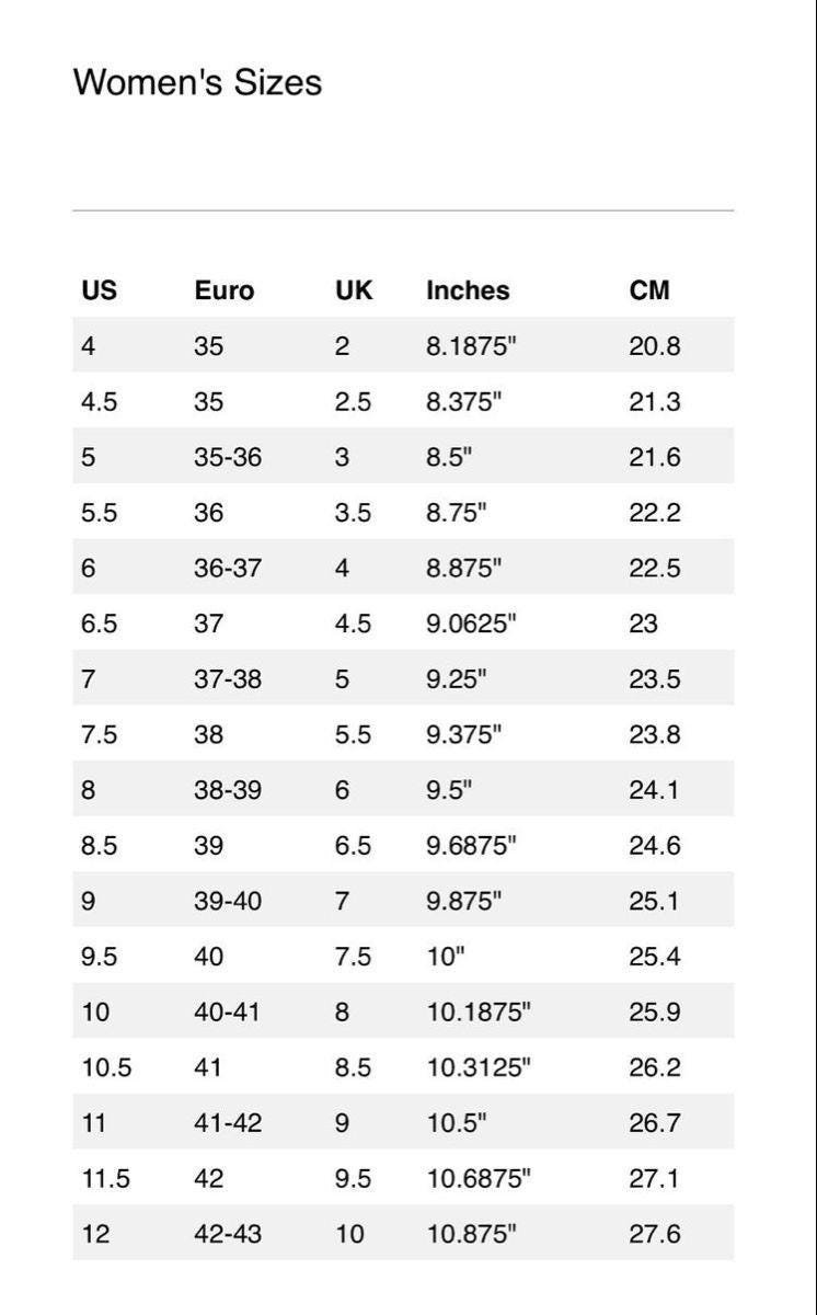 4 US women's ,4.5 US women's ,5 US women's ,5.5 US women's ,6 US women's ,6.5 US women's ,7 US women's ,7.5 US women's ,8 US women's ,8.5 US women's ,9 US women's ,9.5 US women's ,10 US women's ,10.5 US women's ,11 US women's ,11.5 US women's ,12 US women's |