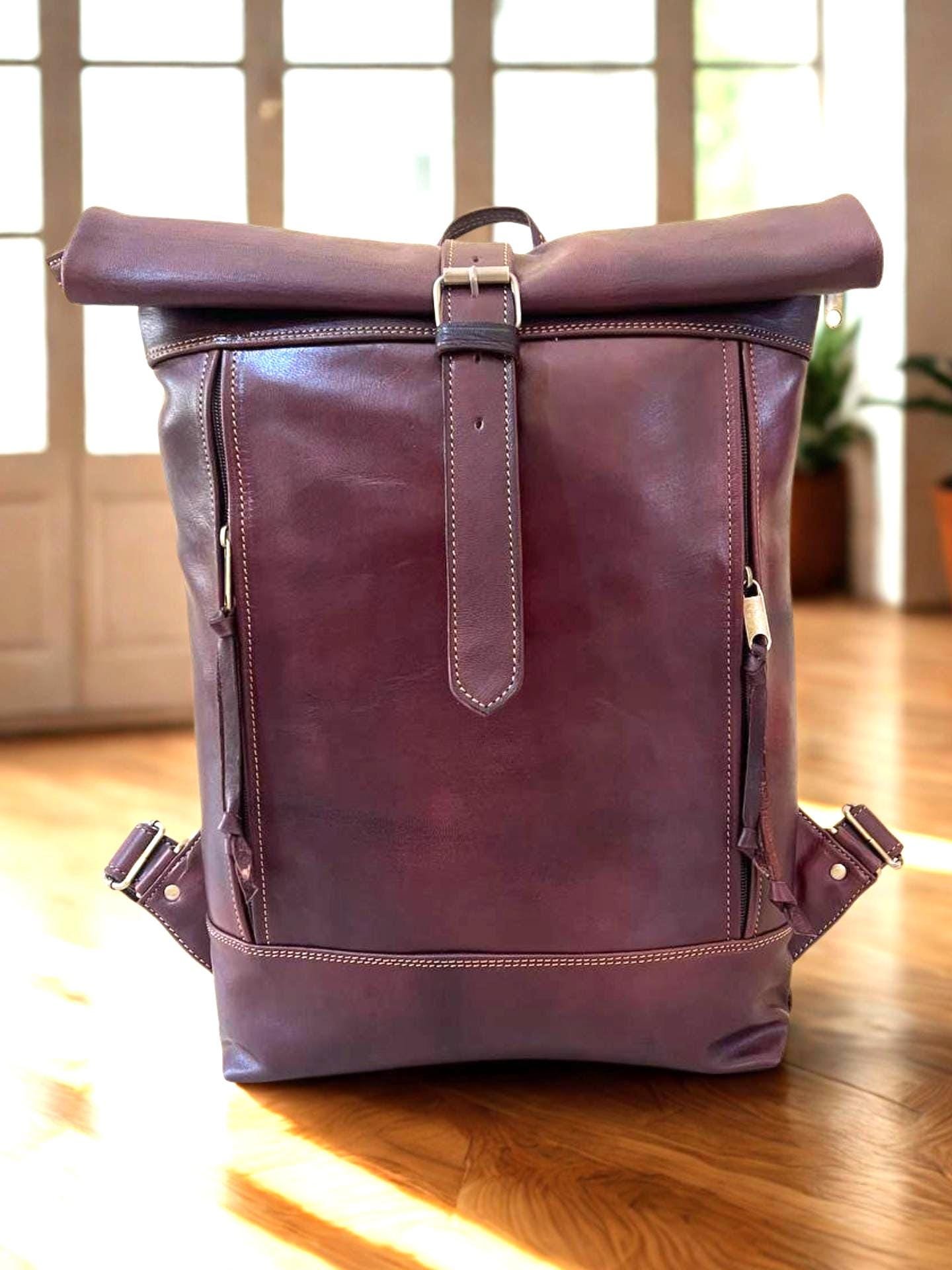 Handmade Moroccan Leather Roll Top Backpack: Minimalist 16&quote; Laptop Bag