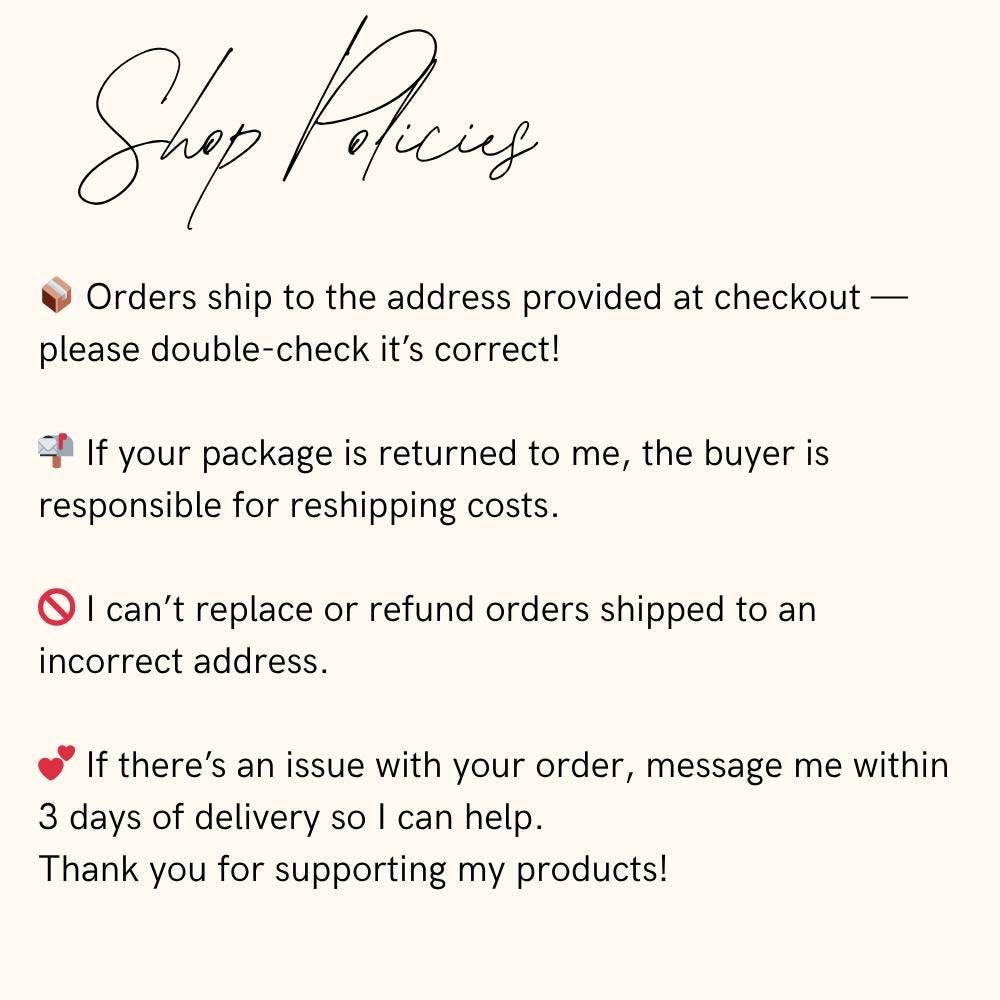 Lost or Delayed Packages: Once your order has been shipped, I cannot control postal delays. If your package is lost in transit, please contact me so we can work together on the next steps.