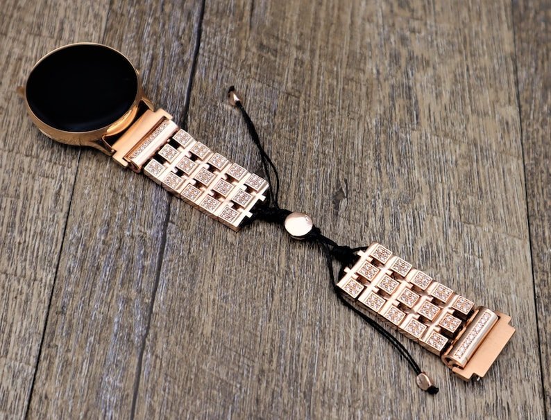 This handmade rhinestone rose gold metal adjustable size waxed cotton cord smart watch band is a stylish and functional accessory that is compatible with Apple, Samsung, Fitbit smartwatch bands. The combination of rhinestones and rose gold metal creates a glamorous and sophisticated look that is perfect for dressing up or down.