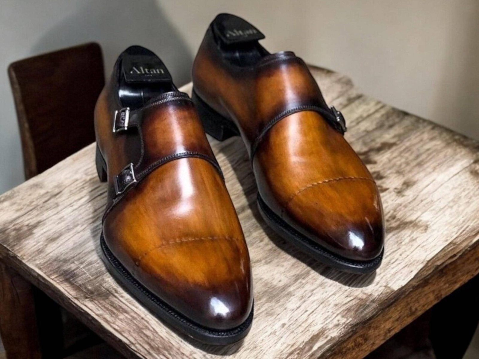 Handmade Shaded Leather Double Monk Strap Shoes: Goodyear Welted