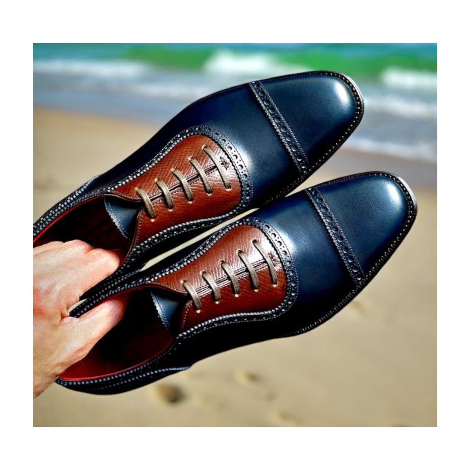Handmade Two-Tone Leather Oxford Dress Shoes: Blue & Brown Cap Toe Brogue