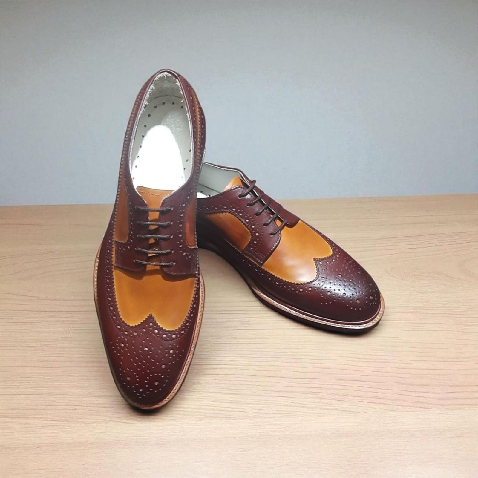 Handmade Two-Tone Leather Wingtip Oxford Shoes: Mustard & Brown