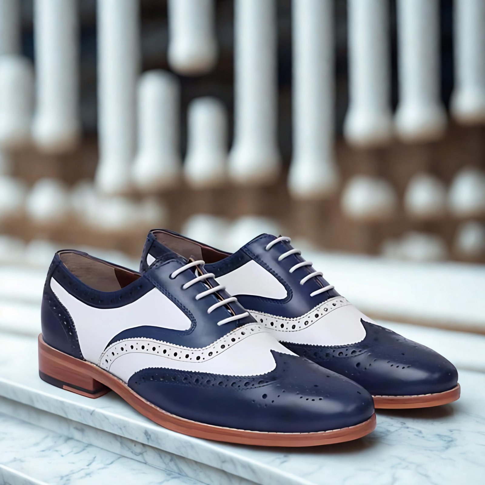 Handmade Two-Tone Oxford Brogues: Navy & White Wingtip Leather Shoes