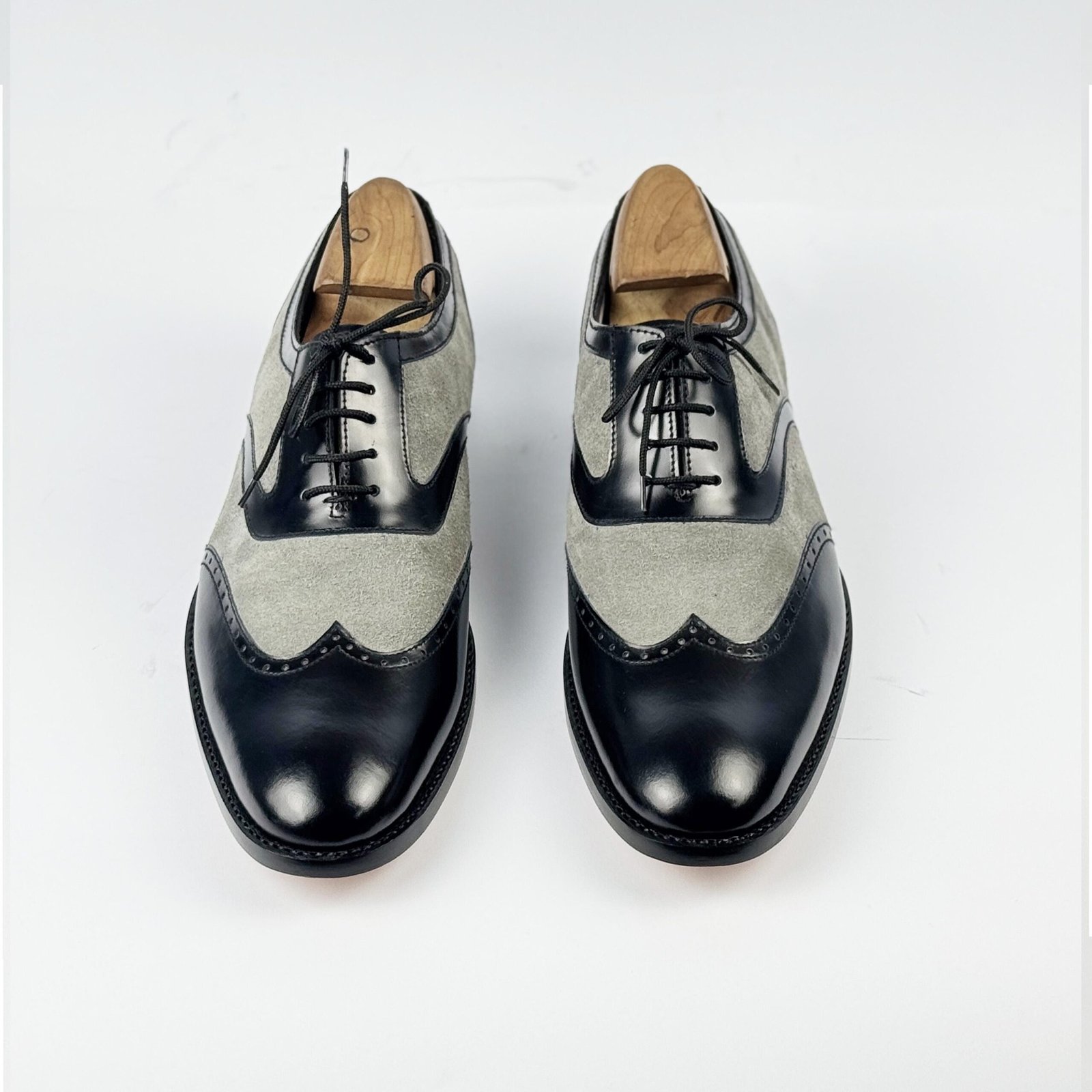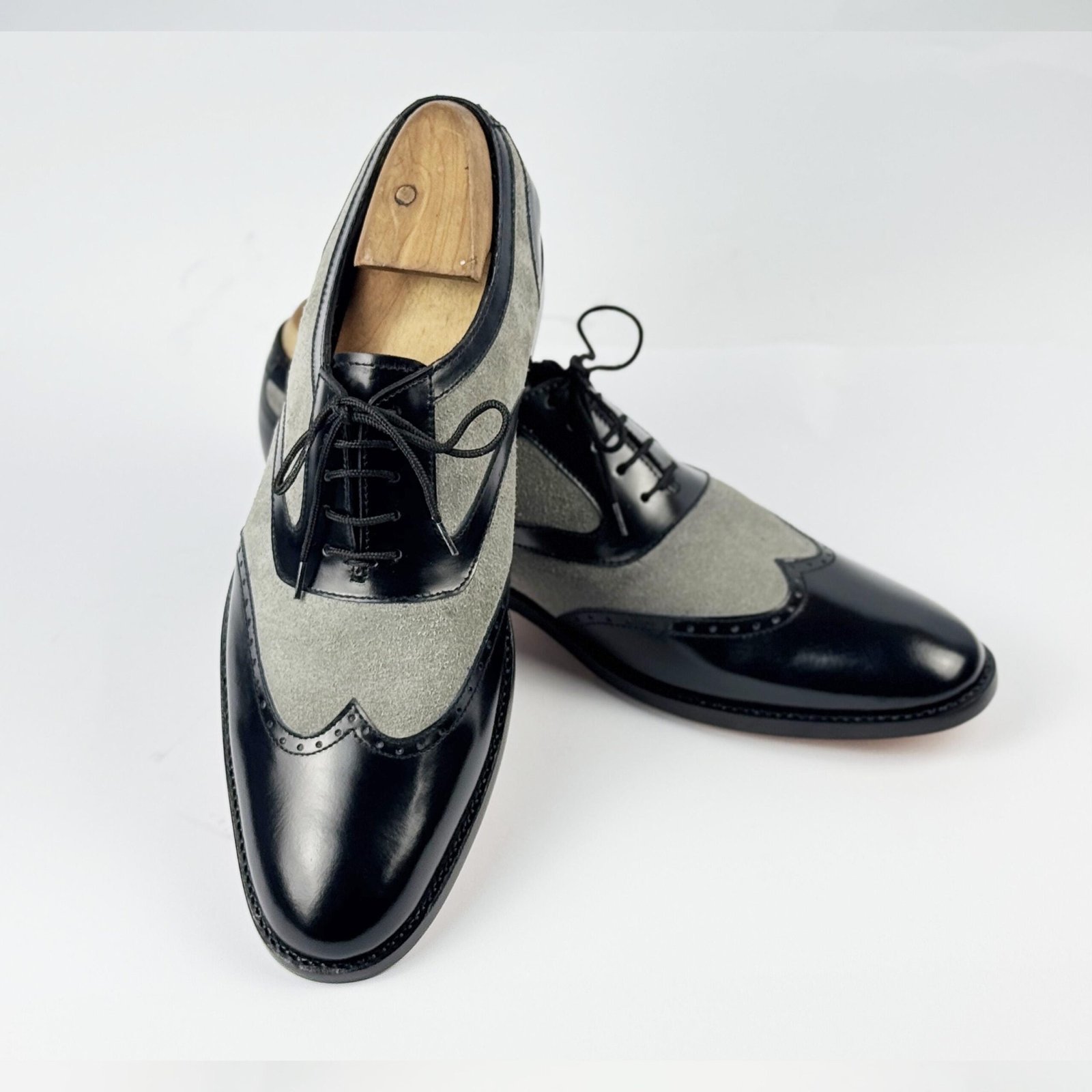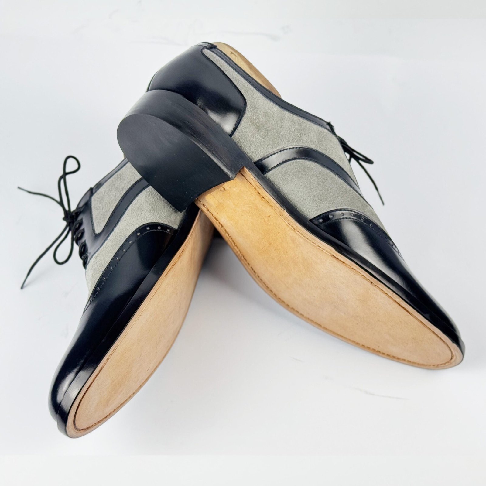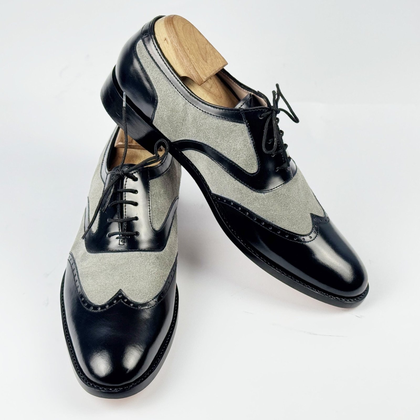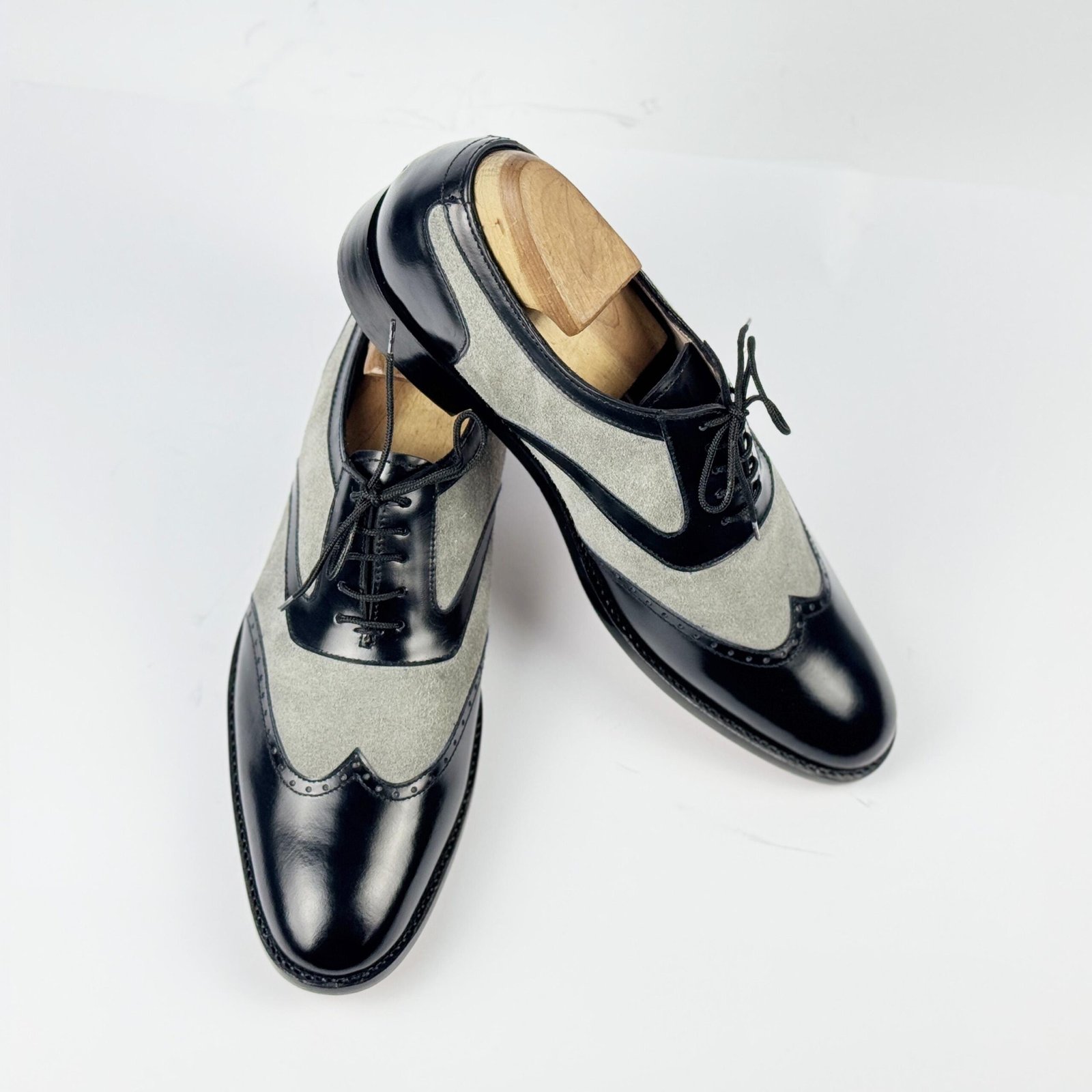 Classic handmade spectator shoes in black leather and grey suede featuring vintage wingtip brogue design. Premium mixed-material construction with Blake stitch craftsmanship. Perfect blend of 1920s elegance and modern sophistication.