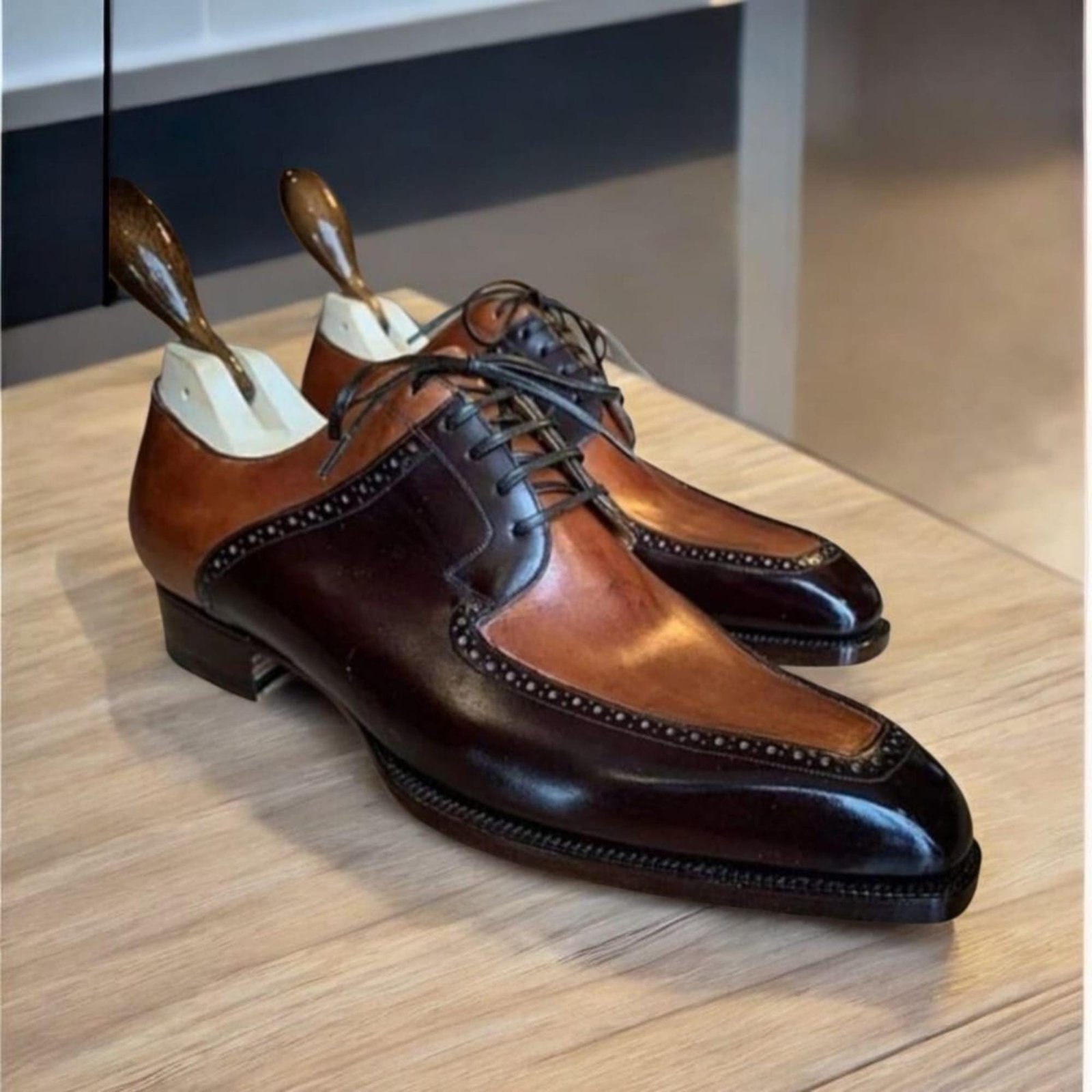 Handmade Two-Tone Tan & Brown Leather Wingtip Oxford Brogue: Classic Derby Dress Shoes